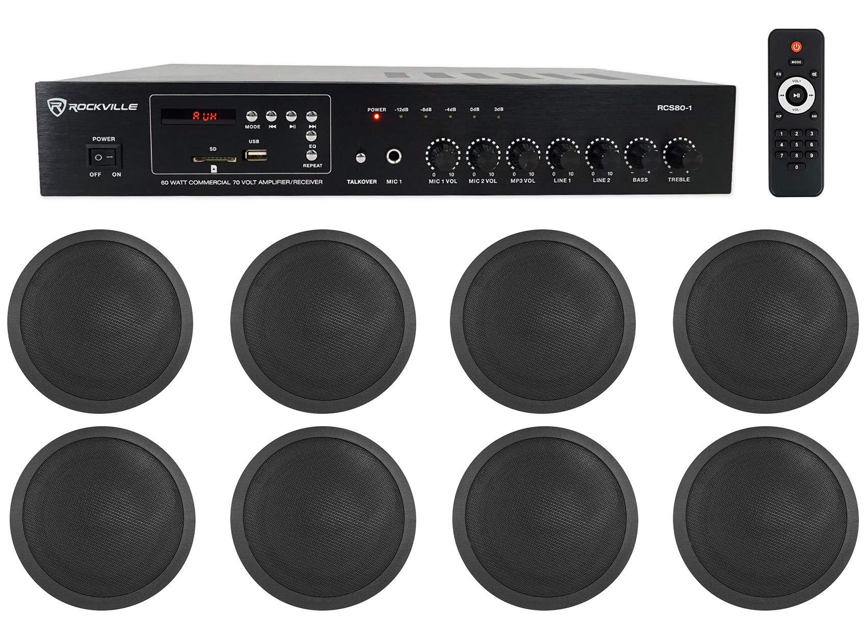 - (1) RockvilIe RCS80-1 60 Watt 70v Commercial/Restaurant Amplifier/Bluetooth Receiver. (8) RockvilIe CCL5T Black 70V 5" Commercial Ceiling Speakers 4 Restaurant/Office. Includes: Amplifier. Remote. Rack mount ears. Power Cable. FM Radio antenna. Owners manual. Warranty. Applications: Restaurant. Bar. Caf. School. Conference room. Lounge. Features: RockvilIe RCS80-1 60 Watt Commercial/Restaurant Amplifier 19" Rack-Mountable (Removable Rack Brackets) Digital Hybrid Amplifier/Receiver