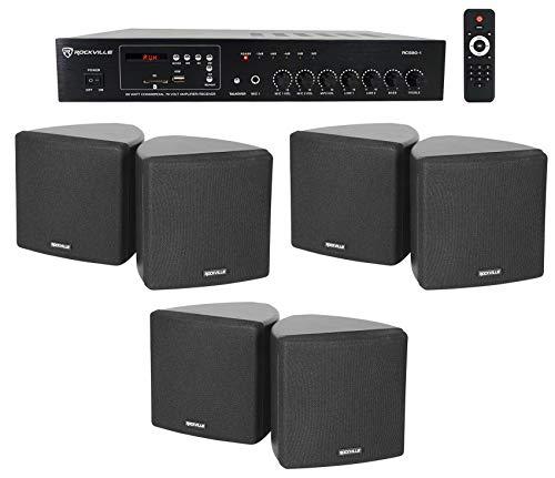 - Package Includes: (1) RockvilIe RCS80-1 60 Watt 70v Commercial/Restaurant Amplifier/Bluetooth Receiver. (3) Cube by RockvilIe Pair of 3.5" Black Commercial 70v Swivel Wall Mount Speakers. Includes: Amplifier. Remote. Rack mount ears. Power Cable. FM Radio antenna. Owners manual. Warranty. Applications: Restaurant. Bar. Caf. School. Conference room. Lounge. Features: