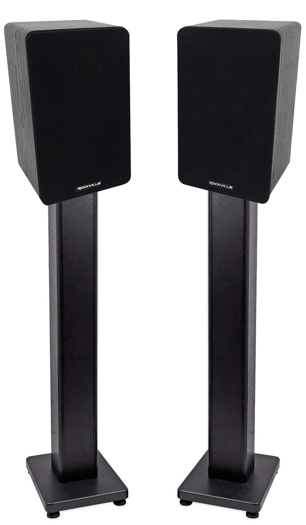 - Features: (2) RockvilIe RHTSB 36" Inch Bookshelf Speaker Stands Surround Sound Home Theater. Pair RockvilIe RHTSB high performance wood speaker stands. (2) Pairs of Top Platforms for different size speakers. Finished with premium furniture-grade paint that will not crack, chip, or peel. Made from high quality medium density fiber core to minimize resonance. Brass & Rubber spikes add stability to any floor surface