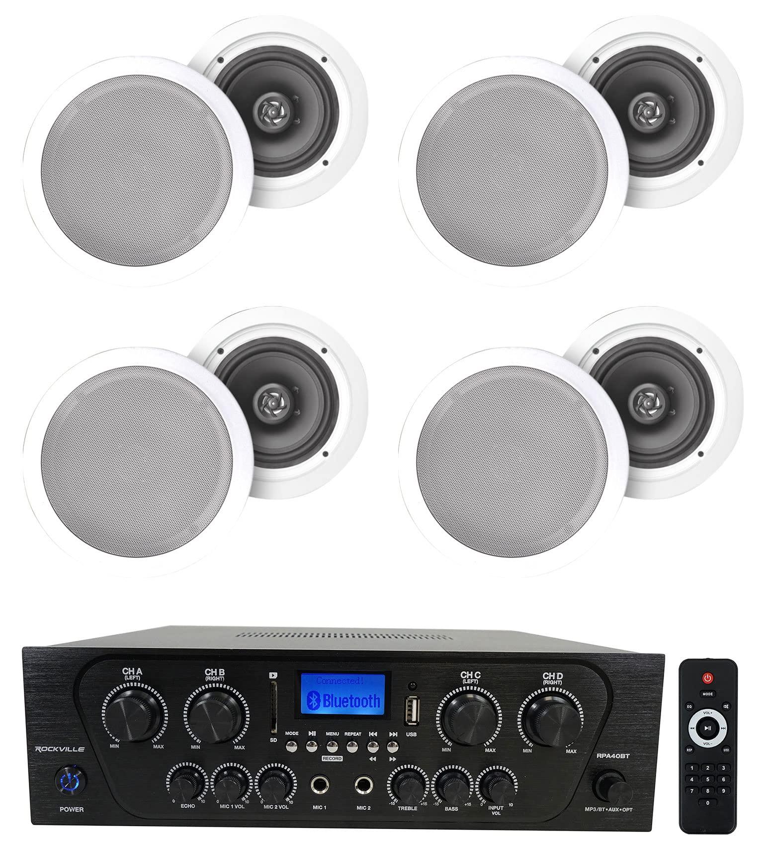 • Package Includes: (1) Rockville RPA40BT 1000w 4 Zone/Channel Home Stereo Bluetooth Amplifier Receiver. (4) Pair Rockville HC655 6.5" 500 Watt In-Ceiling Home Theater Speakers 8 Ohm