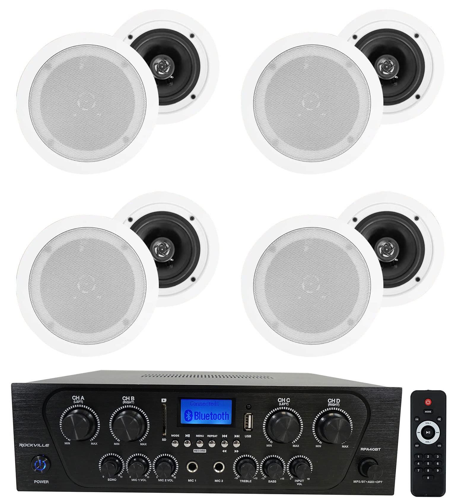 - Package Includes: (1) Rockville RPA40BT 1000w 4 Zone/Channel Home Stereo Bluetooth Amplifier Receiver. (4) Pair Rockville HC55 White 5.25" 300 Watt In-Ceiling Home Theater Speakers 8 Ohm