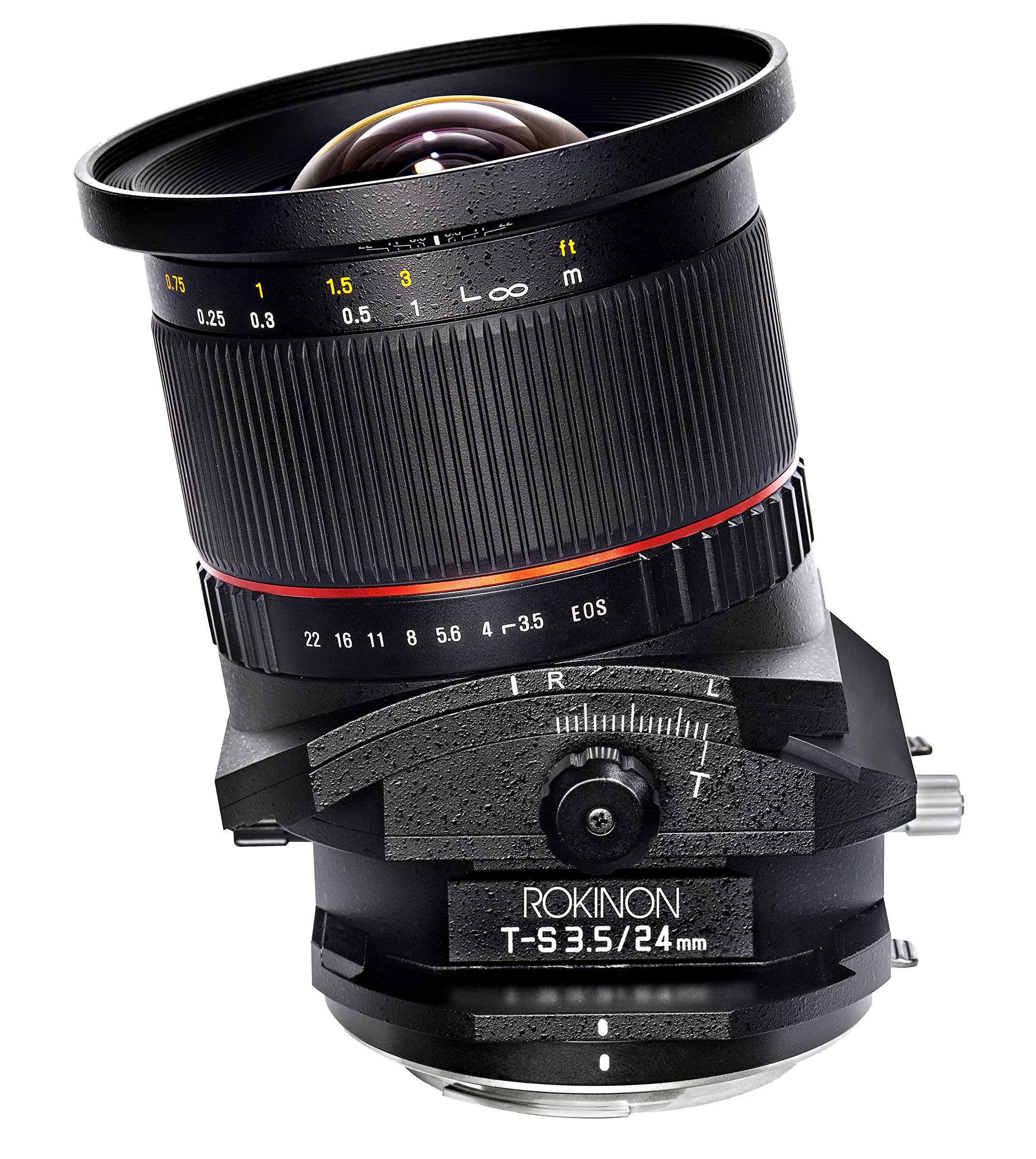 The Rokinon TSL 24mm F3.5 ED AS UMC is a wide-angle, full-frame lens fitted with the perspective control and tilt-shift functions. Similar to the tilt and swing movements of a view camera, a tilt-shift lens allows the user to control perspective and correct convergence of lines within the frame, which can be especially useful in architecture, landscape and product photography. The optical tilt mechanisms enable precise control of depth of field along with perspective control. It is compatible with both digital and film formats with an angle of view of 83.5 and on an APS-C size sensor has an angle of view of 59.9 and focal length equivalent of 36mm (Canon APS-C: 38.4mm/ 56.9). The tilt-shift function on the 24mm f/3.5 lens allows adjustment of the focal plane by an angle of +/-8.5 and enables parallel shift of the optical axis by +/-12mm. The Mount Rotation Lever enables the Tilt and Shift Sections as a combined unit to be rotated RIGHT up to 90 degrees (with 30 degree adjustment). The Tilt Rotation Lever enables the Tilt section to independently rotate LEFT by 90 degrees (with 30 degree adjustment). The lens is comprised of 16 elements in 11 groups, including two Aspherical elements and two Extra Low Dispersion (ED) elements, which reduce aberrations and provide sharp details and accurate color separation. Multi-layered, anti-reflective UMC coating on each lens element provides even light transmission while minimizing flares and ghosting.