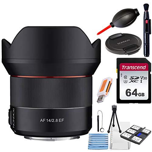 Rokinon AF 14mm f/2.8 FE Lens Front And Rear Lens Caps 64Gb Transcend Memory Card Commander Optics Cleaning Kit (Includes: Mini Tripod, 5 sensor Swabs, 2 Universal Screen Protectors, Memory Card Wallet and Microfiber Ultra gentle cleaning cloth) Lens Pouch USB Card Reader Cleaning Pen & Blower
