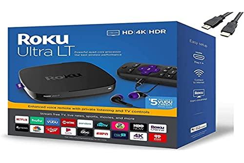 Brand Roku Resolution 4K UHD Wireless Technology Bluetooth Roku Ultra LT is a powerful 4K streaming player featuring a quad-core processor and smooth wired and wireless streaming. Enjoy a seamless streaming experience no matter what you are watching with dual-band wireless, Ethernet port for wired streaming, and microSD port for extra channel storage. Take control with the enhanced voice remote, featuring headphones for private listening plus TV power, volume, and mute buttons. Whether you are streaming in HD, 4K, or HDR, you will get picture quality that is optimized for your TV with sharp detail and vivid color. Roku Ultra LT is great for heavy streamers, for living rooms and primary TVs, and for home theaters. It comes with 4K HDMI Cable.