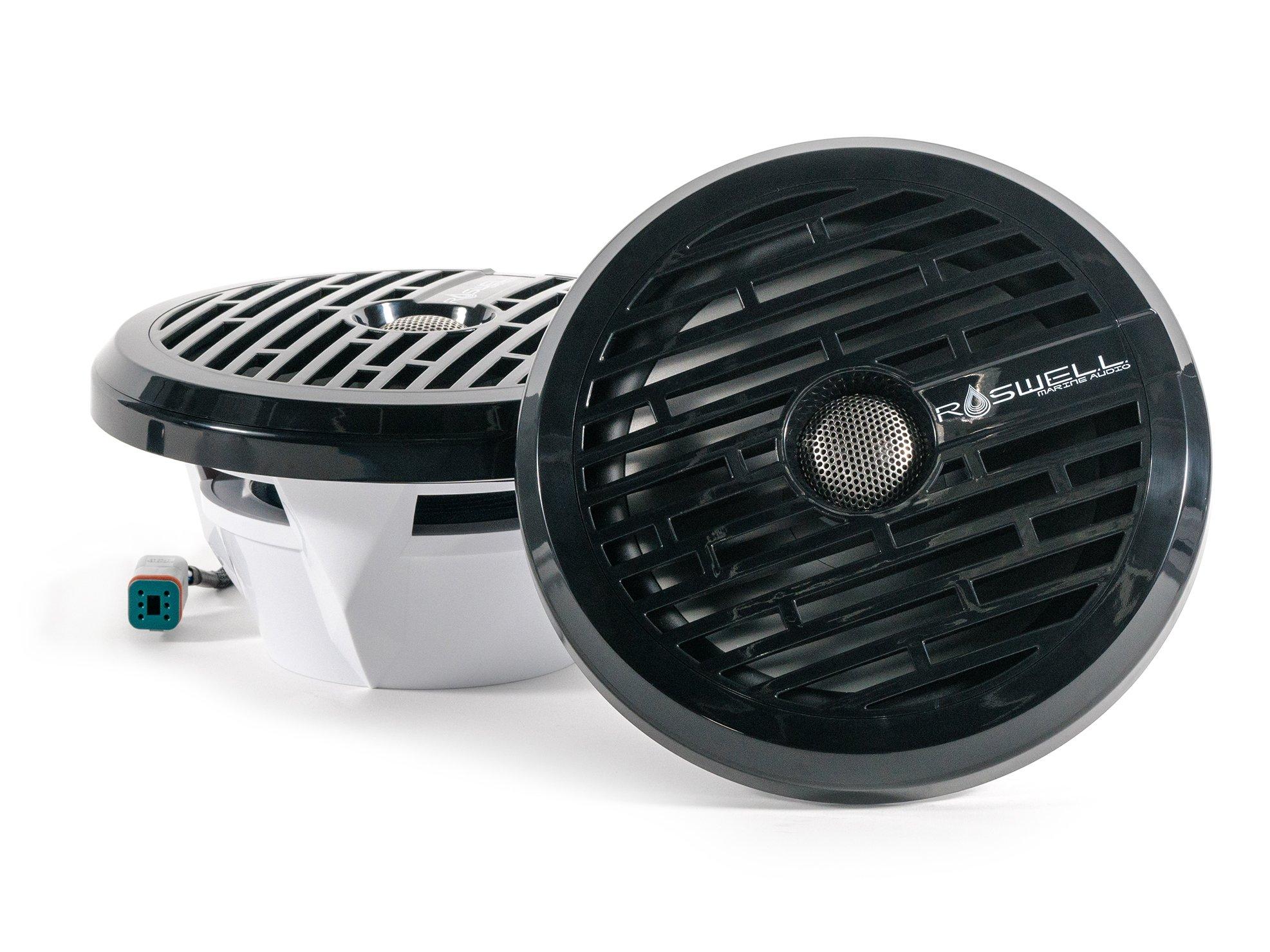 The R1 speakers are the latest addition to Roswell Marine audio lineup. They are purpose-built for extreme durability, acoustic performance, and style. These coaxially-mounted component speakers feature a 25mm/1 inch silk dome tweeter, an integrated 12 db/oct crossover network, on-board RGB LED lighting, and a Flying lead connector for easy installation in tight spaces. Each speaker also includes a locking trim ring which conceals all hardware after installation. All materials and components have been chosen and designed to offer the maximum resistance to rust, corrosion, salt, UV, and humidity. power: 100 watts RMS sensitivity: 90 db at 1W/1M frequency response: 50 Hz - 20 kHz impedance: 4 ohms extreme saltwater and UV resistance.