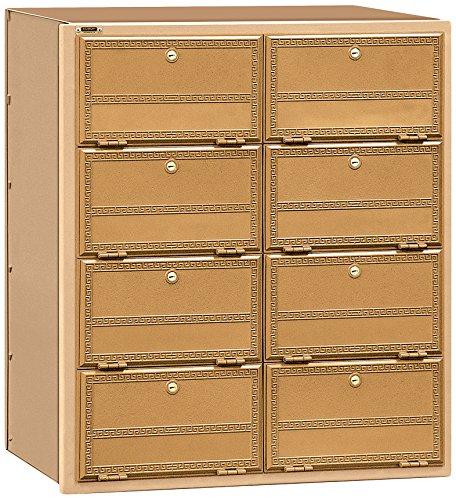 Salsbury 2100 Series Americana Mailboxes - Rear Loading - Private Access ideal for colleges, schools, private postal centers, corporate mail centers, military bases, government agencies and many other applications. Keyed versions can be accessed by the U.S.P.S. when installed in rotary mail centers. Available with 3 different door sizes: (#1) 3-1/2" W x 5" H, (#2) 5-1/2" W x 6" H, (#3) 11" W x 6" H. Available in 4 different configurations: 30 door unit (#1 doors), 16 door unit (#2 doors), 14 door unit (12 - #2 doors and 2 - #3 doors), 8 door unit (#3 doors). Compartments are constructed of 20 gauge steel and feature a powder coated tan finish. Doors are aluminum die-cast with a powder coated brass finish. Doors include a 5 pin cylinder cam lock (with 2 keys). Doors are hinged on aluminum frames. Door frame attaches to individual compartments with 4 screws. Salsbury Industries is an ISO 9001: 2008 certified company and has excelled in the field of manufacturing since 1936.