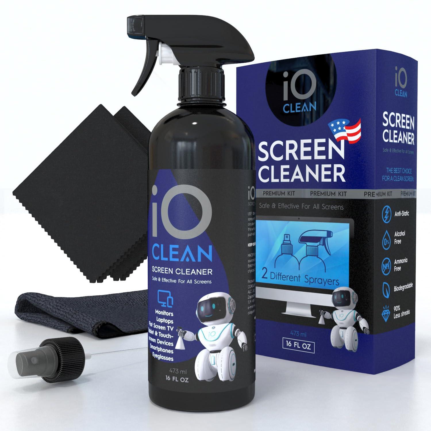 iO CLEAN Screen Cleaner Spray (16oz - 473ml) Best Large Cleaning Kit for LCD LED OLED TV, Smartphone, iPad, Laptop, Touchscreen, Computer Monitor, Electronic Devices, 3 Microfiber Cloths and 2 Nozzles