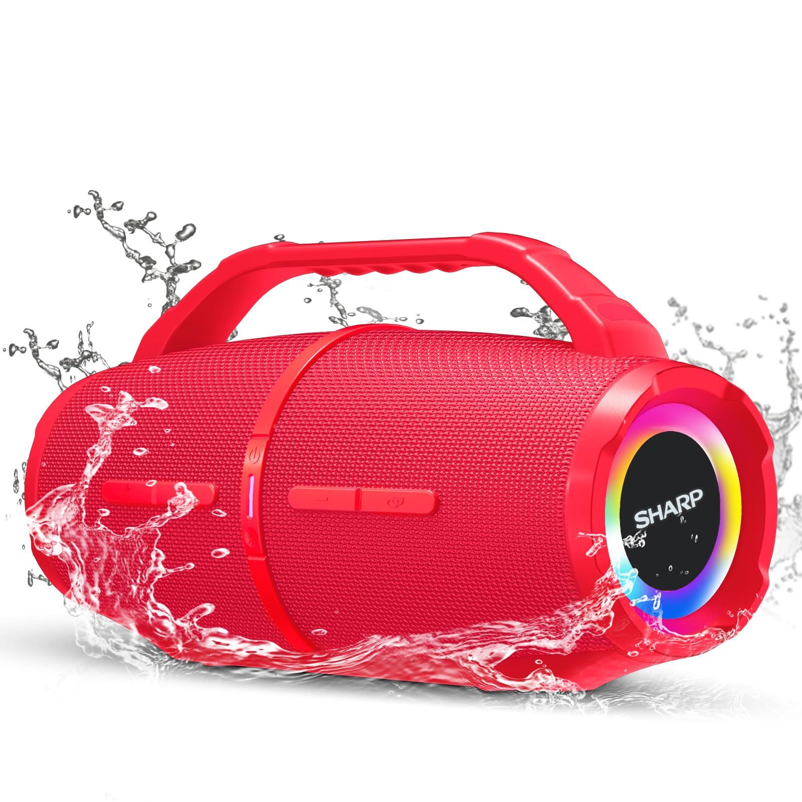 This Sharp GX-BT490 Crystal Clear Series Portable Bluetooth Speaker features DSP Technology | Waterproof IP67 | 10 Hour Playtime | LED Light Effect Modes | 120W Max Power with Deep Bass | True Wireless Stereo Pairing | Built in Mic for Hands-Free Calling | Strap | Comes in a Stunning Red