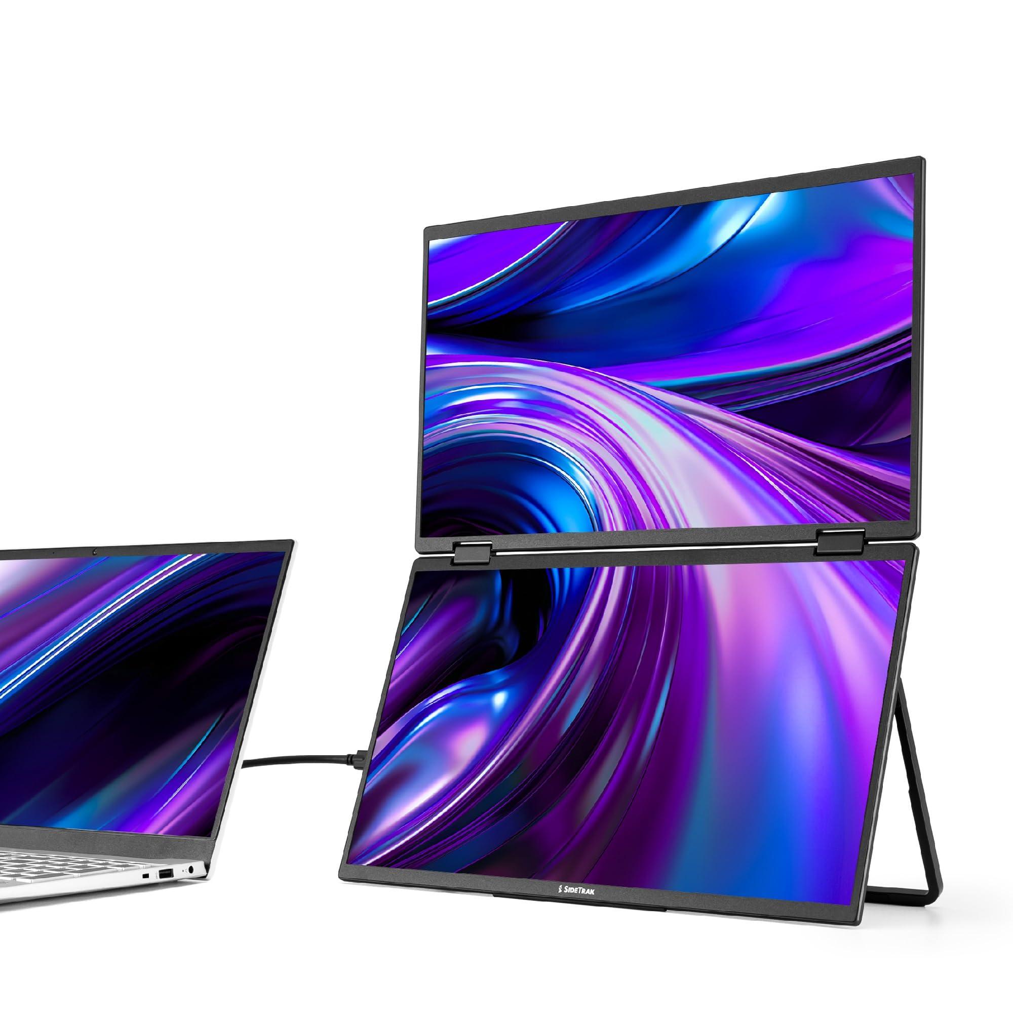 - Stacked Dual-Screen for Space Saving Design Maximize your digital workspace with a vertically stacked dual-screen setup. This laptop screen extender conserves desk space while offering a comfortable, organized layout for multitasking.
