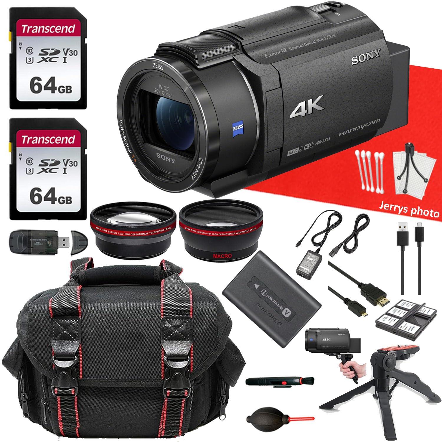 Sony FDR-AX43 UHD 4K Handycam Camcorder + AVX Wide Angle and Telephoto Lens + 2PC 64 GB Memory + Hand Grip Tripod + More (17pc Bundle) (Renewed)