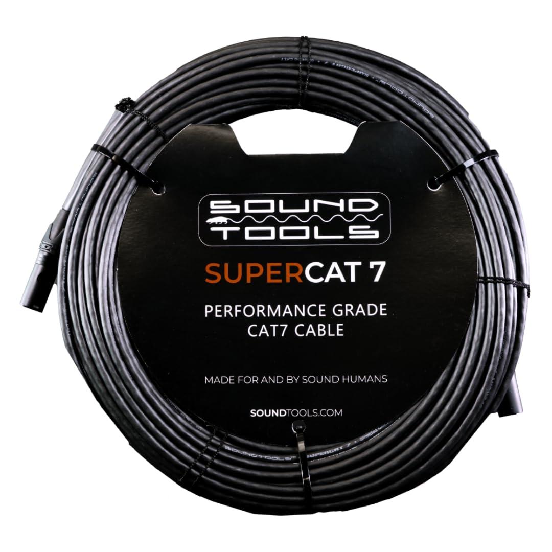 In the era of 24-bit/192kHz data-intensive consoles demanding seamless, high-capacity data flow, the SoundTools SuperCAT 7 CAT7 cable emerges as your essential ally. Engineered for resilience and superior performance. Its construction features a robust polyurethane (PUR) jacket, renowned for its durability and resistance to abrasion, coupled with stranded wires that guarantee reliability in coiling and flexibility in use. Moreover, the SuperCAT 7 excels in environments requiring high-performance connectivity for main drive-lines, digital snakes, or seamless transmission of analog XLR over CAT signals, thanks to its exceptional crosstalk rejection capabilities. When integrated with SoundTools Analog Audio Over CAT solutions, like the CAT Box 8 or CAT Tails, it effortlessly transports up to four lines of analog XLR, COM, DMX, or AES3 over remarkable distances. The cable's advanced S/FTP shielding is meticulously designed to safeguard your signals, ensuring phantom power is consistently delivered when it's most crucial. Tagged as "Performance Grade," the SuperCAT 7 stands out not just for its technical prowess but also for its ability to meet the rigorous demands of professional settings, delivering unmatched reliability and quality signal transmission that today's pro audio environments require.