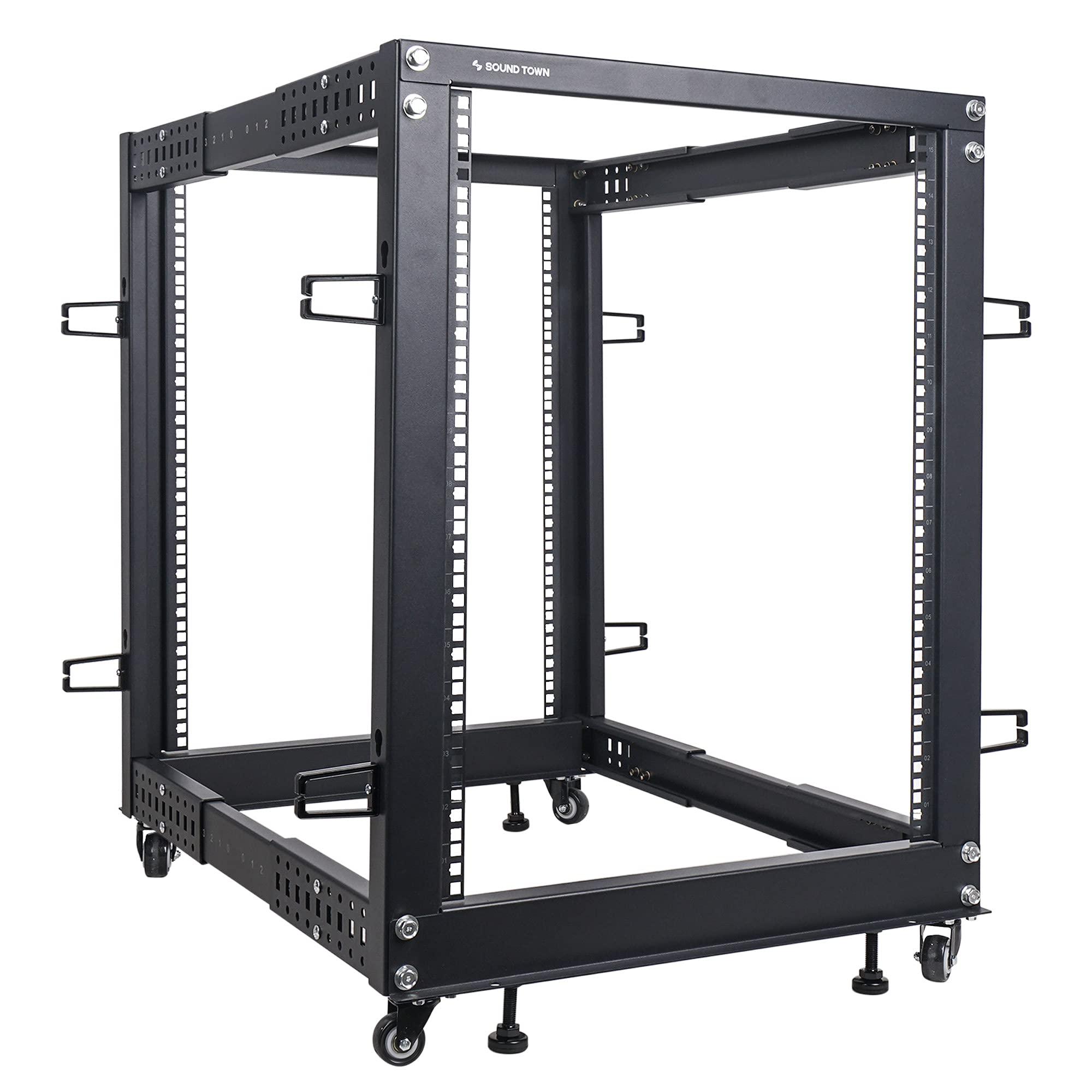 Sound Towns 15U open frame rack with adjustable depth provides fast and easy access to installed PA, server, and network equipment. The ST4POF-A15U is a perfect solution for housing and organizing PA or IT equipment in secure environments where maximum air flow is required. The 15U server rack features top-quality cold-rolled steel construction with a black powder-coated finish for enhanced durability. It supports stationary loads up to 1200 lbs. The ST4POF-A15U comes with all the hardware and parts needed for assembly. Once assembled, it provides great airflow, and easy access to equipment and cabling. Better yet, the rack cases depth can be adjusted from 22" to 40" and accommodates a variety of 19" rack mountable PA, servers and network devices. Casters and leveling feet are also included in the package to provide both fixed and mobile application options. It is perfect for standard PA or IT equipment; amplifiers, microphone systems, crossovers, line switchers, servers, network devices, audio video equipment, and more! FEATURES OPEN FRAME DESIGN:4-Post open frame design provides maximum airflow and allows you to easily adjust cabling and access all equipment from all sides STURDY CONSTRUCTION:Rugged rust-proof steel construction with 15U space, 19-inch width, supports up to 1200 lbs ULTIMATE VERSATILITY:Rack mount depth adjustable from 22" to 40", with easy-to-read marking for both rack units and depth. Compatible with a variety of 19" rack mountable servers, UPS systems and network equipment EASY TO SET UP:Easy to assemble with all required hardware, tools and instructions included. The server rack also comes with accessories such as heavy duty casters, leveling feet, cable management hooks and provides installation flexibility as fixed or mobile VERSATILE APPLICATIONS:Perfect for PA orIT equipment; amplifiers, microphone systems, crossovers, line switchers, servers, network devices, audio video equipment, and etc. SPECIFICATIONS Package Weight 50.2 lbs Package Dimensions 34.3 x 15.7 x 6.3 (inches)