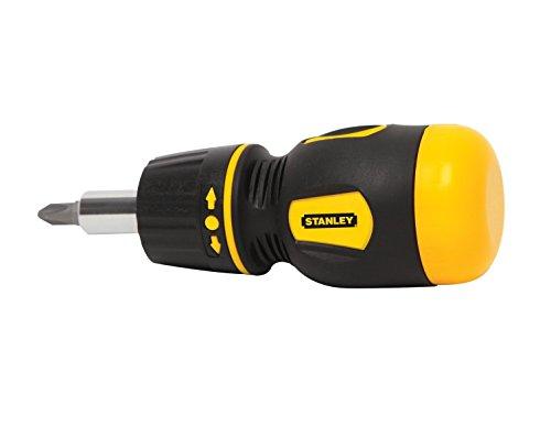 The Stanley stubby ratcheting screwdriver features a three-position switch which enables clockwise and counter-clockwise ratcheting and locked positions. This all purpose ratcheting screwdriver features 6 interchangeable tips (Bits Include: 1 Pt Philips bit, 2 PT Philips bit, 1/8-Inch Slotted bit, 3/16-Inch Slotted bit and 1/4-Inch Slotted bit) with an internal bit storage system for easy access. The stubby design makes it ideal for tight or limited space areas. Another feature of this product includes a durable bi-material comfort-grip making this screwdriver a must have on the jobsite or around the house. This screwdriver is ideal for applications including plumbing, HVAC, household and mechanical repairs.
