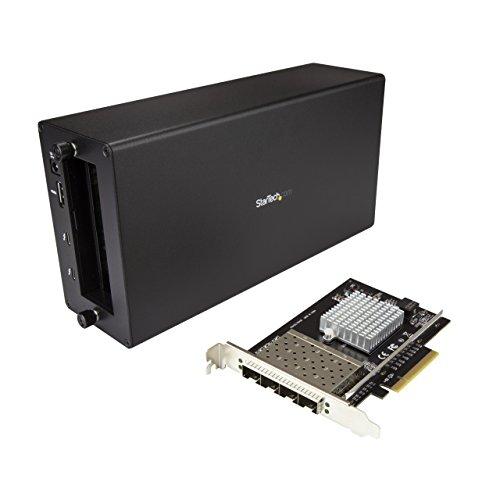 This Thunderbolt 3 10GbE NIC adapter lets you connect a Thunderbolt 3 device to a 10GbE network. The adapter combines the Thunderbolt 3 technology of TB31PCIEX16 with the 10GbE dual-fiber connection of PEX10GSFP4I (Intel XL710 chipset). The assembled adapter features one DisplayPort output, one additional Thunderbolt 3 port, and four open 10GbE SFP+ slots. Mission-critical connectivity
