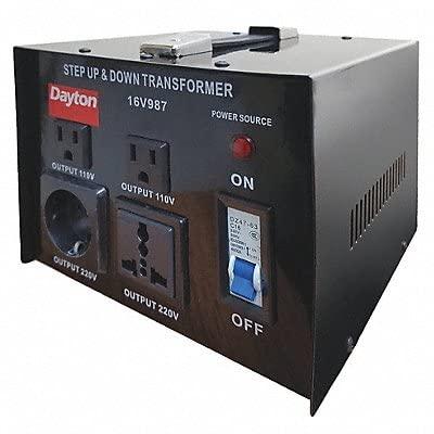 Step Up/Step Down Voltage Converter, Converts 110 to 220V AC, 220 to 110V AC, VA Rating 1.5kVA, 50/60 Hz, Mounting Portable, Enclosure Material Black Vented Metal, Height 7.5 in, Depth 9.75 in, Width 9.75 in, Includes (2) Outlets, 15A Fuse, Insulated Power Cord, On/Off Switch With Power Indicator Light