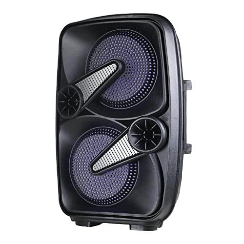 • : Equipped with a rechargeable battery and built-in handles, this speaker is easy to transport. It comes with a remote control, and 1 wired microphone, and features a flashing light on the woofer for added visual appeal.