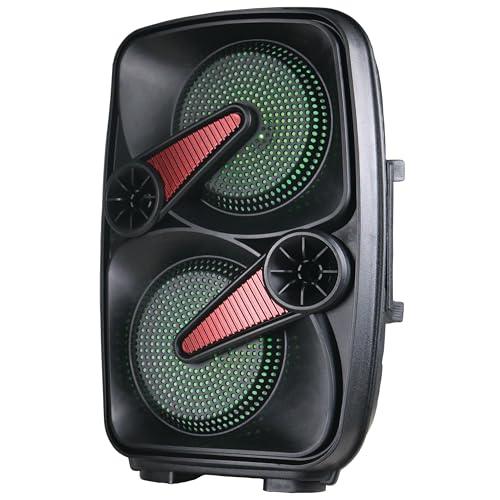 - : Equipped with a rechargeable battery and built-in handles, this speaker is easy to transport. It comes with a remote control, and 1 wired microphone, and features a flashing light on the woofer for added visual appeal.