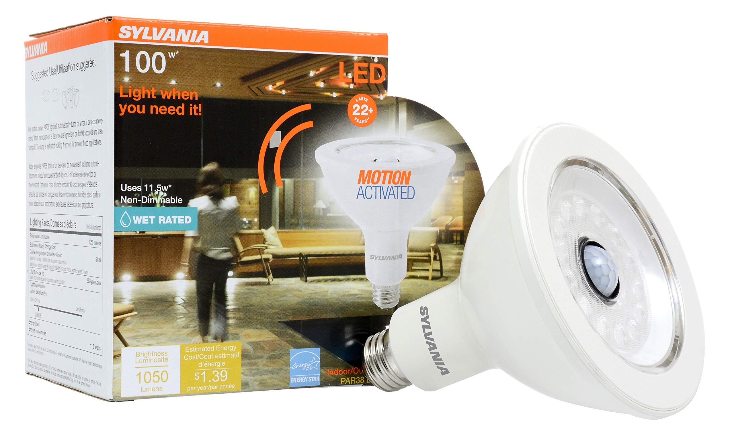 SYLVANIA ULTRA LED Motion Sensor PAR38 lamp detects motion and illuminates. The built in motion sensor has a Flood (40) angle of sensing, with a range of 10-15 feet. The lamp turns on when it detects movement and stays on for 90 seconds then turns off when movement is no longer detected. The LED Motion Sensor PAR38 is ideal for illuminating driveways, back yards, parking lots, and porches without the need to physically turn on the light switch. The bulb can also be used for security and safety purposes when an area is hazardous without any lighting. These 11.5W lamps deliver 1050 lumens with a color temperature of warm white 3000K and a long rated life of 25,000 hours (L70).