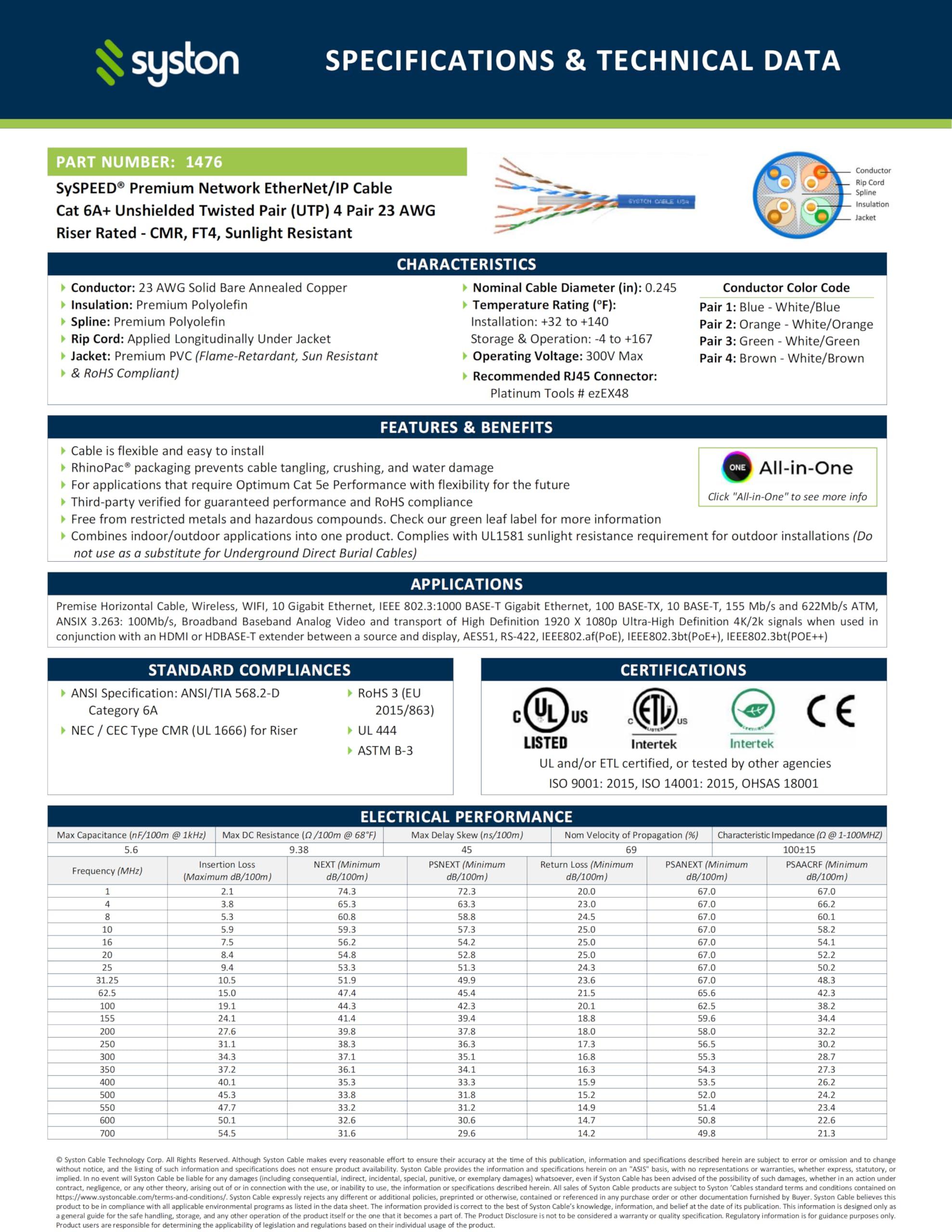 Syston Cable Tech Cat6A+ Bulk Raw Ethernet Cable Blue Bulk 700MHz 150 ft 23AWG 4pr Unshielded Twisted Pair UTP Solid Bare Copper Riser CMR Heat UV resistance Indoor Outdoor Order to Cut