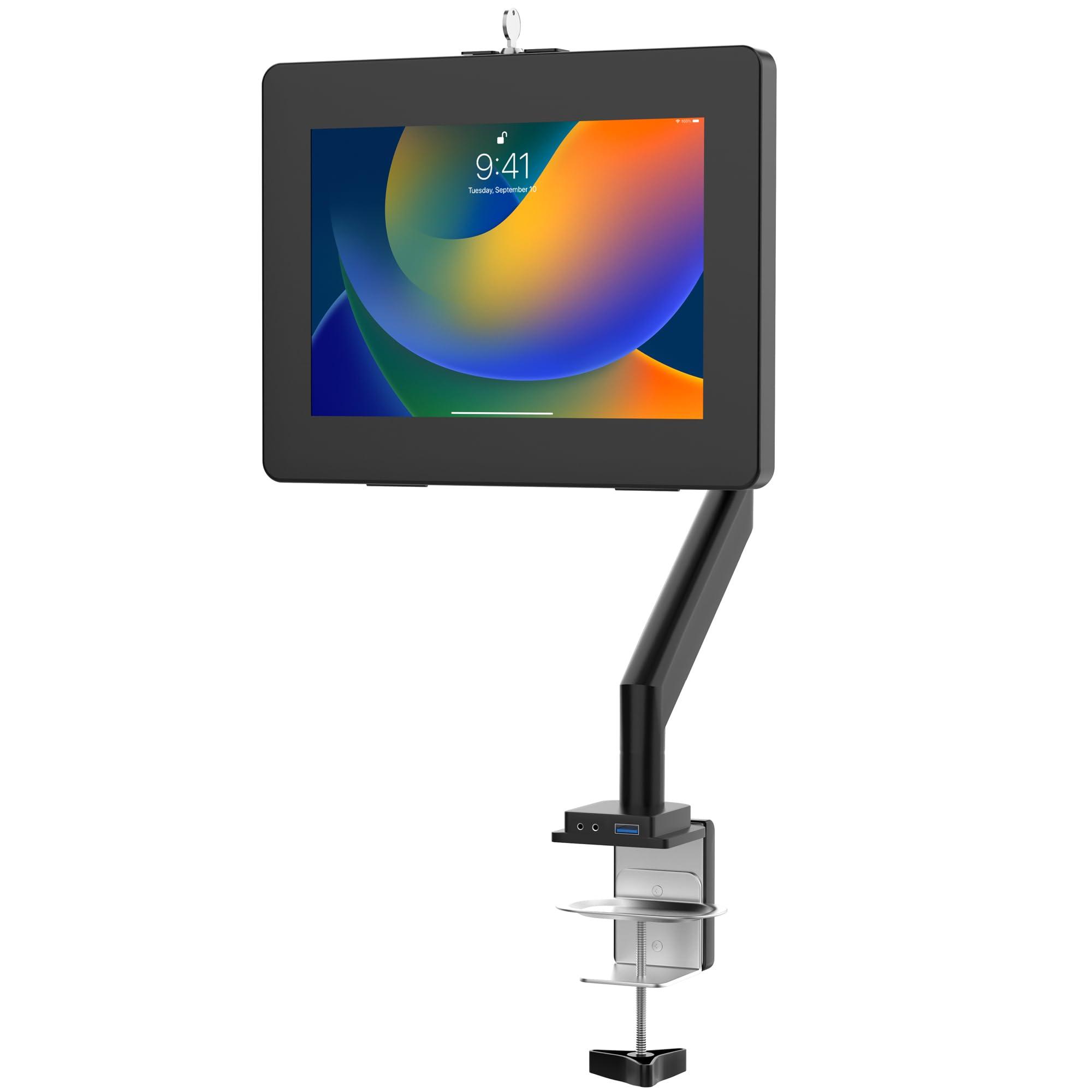 This durable security enclosure and sturdy arm mount combines a generous set of adjustments, joints, and pivot points, convenient clamp, and case transforms any counter, desk, or table into a versatile digital workspace. The arm installs easily using an adjustable scratch-protected C-clamp. The VESA plate at the top easily attaches to our bestselling tablet enclosure (or other VESA-compatible cases). The enclosure features a powerful lock and key security system that protects your device, making this the perfect mount for the office, classroom, restaurant, or retail location. The mount features a full 90-degree rotation for use in either landscape or portrait orientation. The spring-loaded elbow joint adjusts 180-degrees. To create the perfect work angle, simply loosen the mid joint with the included Allen wrench, position, and tighten. The base joint rotates 135-degrees to facilitate just the right viewing angle. At the base of the mount, youll find a handy USB extension port for easy charging while in use. Just plug the attached USB cables into a computer or other power source, then plug your tablet directly into the base of the stand. Interior cable routing system within the arms gives ample space to keep cords out of site.