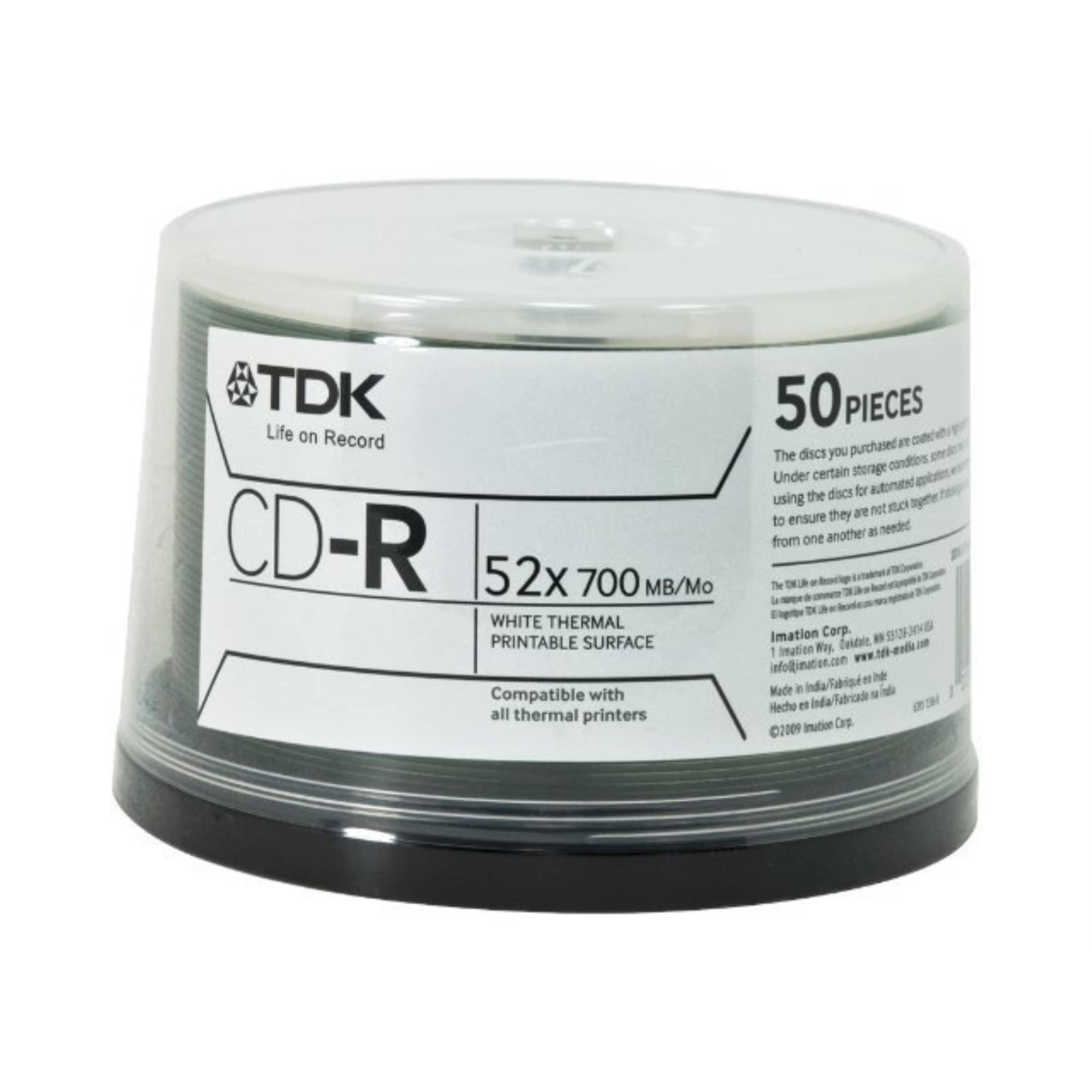 CD-R 80MIN 700MB 52X write speed thermal white surface hub printable in 50 pack spindle - Hub printable for use in thermal printers (Rimage Everest I or II) (no logo). Geared for disc duplicators. Works in any speed CD-RW drive.