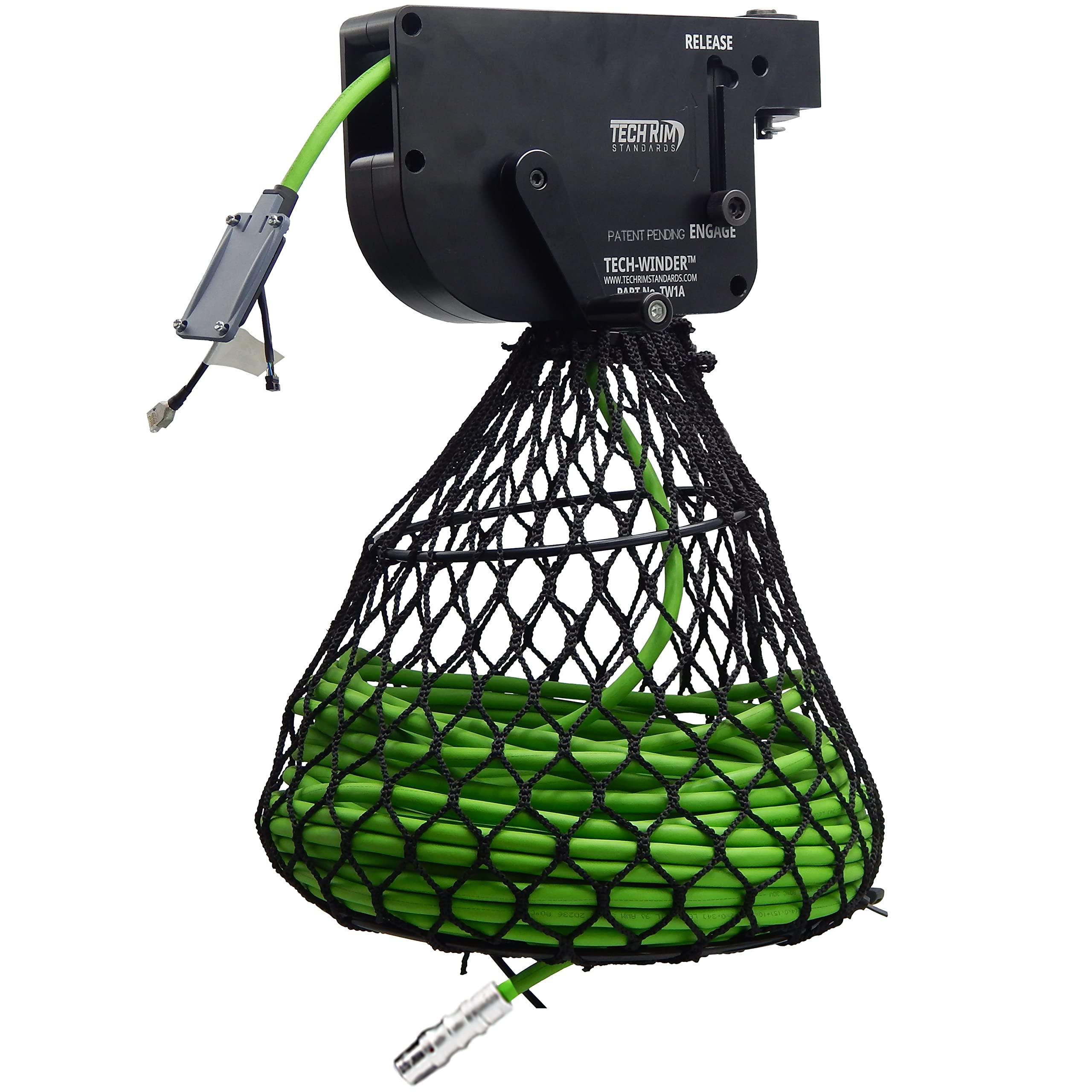 The Tech-Winder is a robust solution for industrial cord management. Aluminum body, for hard impact protection. Flame retardant netting, for added protection against any sparks that may come into contact with the cord. This industrial grade cord reel, keeps your pendant cords protected and organized. Stores up to 50 meters (164 ft.) of cable in length. Works on cables with a diameter of 4.5 mm to 10.0 mm. Cables of 10mm may require two hand operation with the Tech-Winder. Overall Product Dimensions are 476mm (L) x 315mm (W) x 275mm (H) / 18.5" (L) x 12.40" (W) x 10.80" (H). Overall Product Weight is 3.1 kg (6.8 lbs.) total. For more, visit techrimstandards.com/tech-winder/ to learn additional product information.