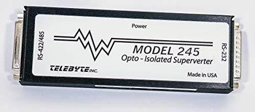 The Model 245 RS-232 to RS-422/RS-485 Optically Isolated Interface Converter is an optically isolated version of the Model 285. When operating as an RS-232 to RS-422 interface converter, the Model 245 converts full duplex data, TD and RD, between RS-232 and RS-422.When operating in RS-485, Model 245 has an "intelligent" mode which provides control of the RS-485 line. The Model 245 controls its transmitter data flow in two ways, the use of RTS, pin 4 of the RS-232 port, or turning it on when TD data is applied to the RS-232 port. In the 2-wire mode when no data is received by the RS-232 receiver, the RS-485 receiver is switched ON. When data is detected for transmission the receiver is switched OFF. In the 4-wire mode the RS-485 receiver is constantly ON while the transmitter is switched as required. The Model 245 has an eight-position dip switch that is used to select the following: RS-422 mode - 4 wire RS-485 mode - 2 wire or 4 wire RS-485 mode - controlled by the RTS, DTR or data 220-Ohm terminator A DTE/DCE switch reverses pins 2 and 3 of the RS-232 interface. TD and RD LED's on each side of the optical barrier help verify operation. Both ports of the Model 245 are implemented with DB-25 connectors; a male for RS-232 and female for RS-422/RS-485. This unit is powered with an external linear 110 volt AC adapter.