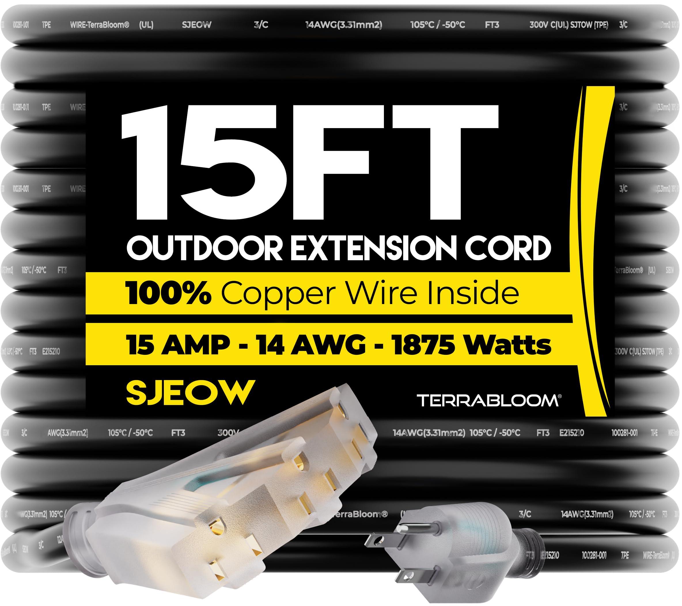 - IMPROVE EFFICIENCY AND TIME SAVINGS:Tired or walking back to swap the tools plugged into your extension cord or check if it's even powered? Our professional-grade outdoor extension cords multiple outlets for simultaneous operation of 3 tools and a glowing light indicator for when the cord is powered. We use 100% highest grade oxygen-free copper wire inside and our 14 Gauge cords are rated for 1875 Watts and 15 Amps - the maximum allowed UL rating for extension cords with NEMA 5-15P plugs