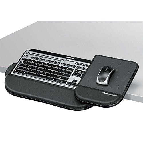 The Fellowes Tilt 'n Slide ProTM Keyboard Manager features the Comfort GlideTM System - mouse tray slides over numeric key pad. Strong brackets easily attach to desktop edge up to 1-3/4" thick without tools, allowing platform to effortlessly tilt and slide. Extended knee clearance keeps you comfortable while typing and mousing. Attaches to desktops up to 1-3/4" thick without surface damage. Single lever easily adjusts tilt (flat to 30) and slide (4-5/8" travel distance). Unique textured surface keeps mouse from sliding off mousing platform. Ultra soft memory foam wrist support with Microban antimicrobial product protection keeps product cleaner.