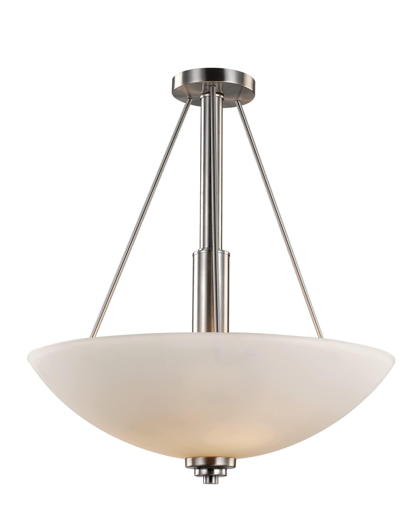The mod pod Collection supplies ample lighting for your daily needs, while adding a layer of modern style to your home's decor. It is perfect for adding a warm glow to a variety of interior applications. The mod pod Collection is modern style indoor lighting, with a transitional urban influence. The mod pod 20 inch pendant has a white Frost glass bowl shade, a round canopy with rods that reach downward to the shade and includes a chain for hanging.