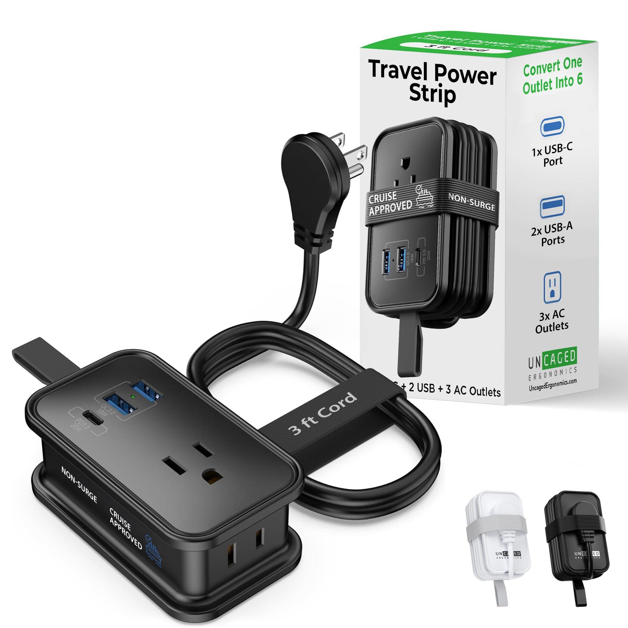 Uncage Ergonomics Portable Travel Power Strip with USB Ports, the ultimate solution for professionals, students, gamers, remote workers, designers, presenters, and vloggers who need reliable power on the go. Experience unparalleled versatility with our travel power strip, converting one outlet into six with ease. Featuring 3 AC outlets (1250W), 2 USB-A ports (2.4A), and 1 USB-C port (20W), it's perfect for charging multiple devices simultaneously. Designed with portability in mind, our power strip boasts a compact and convenient design. Its flat plug and 3-foot cord, secured by an attached bungee strap, make it incredibly easy to carry. Hang it from your bag with the convenient loop, ensuring you're always prepared wherever your travels take you. Whether you're working from a coffee shop, airport, hotel, or cruise ship, our travel power strip ensures you can charge all your devices with ease. A non surge protector for cruise ship power strip, meets the specific requirements of maritime environments, providing you with reliable power wherever you go. Compatible with a wide range of devices, including laptops, smartphones, tablets, cameras, and more, our power strip offers universal compatibility. Say goodbye to the hassle of carrying multiple chargers our travel extension cord with usb ports has you covered. Don't let a lack of outlets hold you back invest in our Portable Travel Power Strip with USB C Ports and stay powered up wherever life takes you.