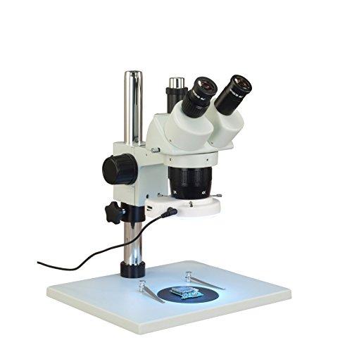 This is a table stand super widefield trinocular stereo microscope with 20X and 40X magnification settings. It includes a pair of super widefield high-eyepoint WF10X/20 eyepieces coming with 45 inclined 30mm eyetubes with left eyetube diopter adjustment, a 56-LED ring light. and is mounted on a wide table stand with rack and pinion adjustment. The super widefield optics and high-eyepoint design ensure an easy and comfortable observation. Its adjustable trinocular port allows you to add photo or video capability. The included ring light provides cool, even, shadowless light across the field of view and is intensity adjustable. The microscope provides high resolution clear images, super widefield of view and large working distance.