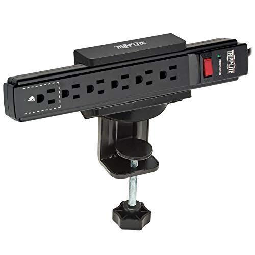 Power Strip Clamp Mounts Securely on Your Desktop without Drilling This clamp-on holder for power strips and surge protectors is easy to install without the hassle of drilling into walls or workbenches. Keep AC outlets and USB ports within easy reach of your desk, table or workspace by attaching the CLAMPUSBLK to any flat surface 0.4 to 2 inches thick. No tools are needed. Just slide the clamps onto the surfaces edge, tighten the adjustment knobs by hand, and snap your surge or power strip into the mounting clip. No More Crawling Under Desks to Plug Devices into Hard-to-Reach Outlets Add AC and USB power where you most need it. The CLAMPUSBLK lets you install a power strip or surge protector within an arms reach of your chair. The heavy-duty plastic clamp accepts most strips 1.6 to 2.4 inches in width. Soft EVA foam pads on the clamp protect your desk from scuffs and scratches. Retrofit Existing Installations to Improve Access to Outlets Add AC outlets and USB ports somewhere new or change the mounting of an existing power or surge strip to improve access to power. A cable management clip in the rear keeps power cords neat and tidy.