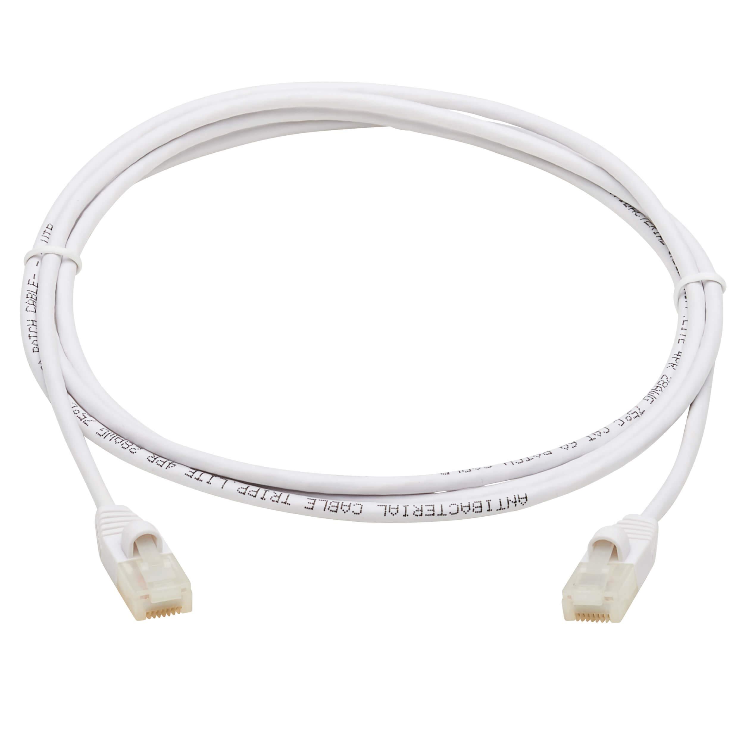 Cat6a Cable Ideal for Connecting Equipment in Your 10G Ethernet Network. This Cat6a Ethernet cable (M/M) with RJ45 connectors transmits 10 Gbps data, voice and video through high-speed 10G equipment, including network switches, modems, servers, routers, adapters, hubs and patch panels, in high-density data centers. Designed for fast transmission and excellent signal quality, this Cat6a cable ensures peak performance throughout your local area network (LAN). Special Slim Design for Better Airflow and Easier Installation. This 10G cable is more than 38% smaller in diameter than standard Cat6a cable. This increases airflow in tight spaces, which helps keep your equipment cool and properly functioning. It also cuts down on clutter in crowded racks and patch panels, and makes the cable easier to install around corners and through cable management panels. Snagless RJ45 Male Connectors Keep Tabs Intact During Installation. The RJ45 connectors' snagless design protects the locking tabs from being damaged or broken off during installation. Integral strain relief gives the cable extra flexibility, reduces stress and helps the cable move freely without cracking or breaking loose from the connector. Premium Construction for Superior Performance. Manufactured from 28 AWG copper wire, the four-pair stranded cable is rated for speeds up to 10 Gbps. The RJ45 connectors improve near-end crosstalk (NEXT) performance to 500 MHz and feature 3-micron gold plating to help ensure the most accurate signal transfer possible. White Jacket Helps Avoid Misidentification That Can Cause Costly Downtime. The cable has a white PVC jacket, which is easy to identify quickly in a crowded patch panel or switch and helps prevent the cable from becoming accidentally disconnected.
