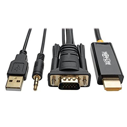 The P116-006-HDMI-A VGA + audio to HDMI adapter cable (M/M) saves you money on costly computer upgrades by converting a VGA video + audio signal for display on an HDMI monitor, projector or television. You can display a rich high-definition (HD) signal in your home theater setups, media presentations or digital signage using your tried-and-true analog source equipment. The cable is ready to use right from the box with no software or drivers to install. It's powered via the built-in USB cable, so no external power supply is required. This six-foot cable supports HD video resolutions up to 1920 x 1080 (1080p) at 60 Hz. Connect the VGA plug to your computer's VGA port, the built-in 3.5 mm stereo plug to your computer's audio jack, and the built-in USB cable to a USB port on your computer or a USB charger. Then, connect the HDMI plug to your display's HDMI input port. The P116-006-HDMI-A complies with HDCP 1.2 and HDMI 1.3 standards. Corrosion-resistant gold-plated connectors and contacts provide maximum conductivity and minimize data loss. 2-Year limited warranty