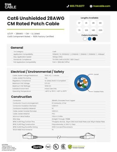 Unlike generic, mass-produced cables, trueCABLE Cat6 Patch Cables are: Individually Certified: Exceeds industry standards with rigorous testing of every cable, ensuring peak performance and consistent quality. Perfect for Diverse Applications: Thin diameter design allows for easy installation in tight spaces, like patch panels, racks, and furniture. PoE++ (4PPoE) Ready: Supports Power over Ethernet (PoE) up to 100W, ideal for powering devices like IP cameras and VoIP phones. Built to Last: Features gold-plated connectors for exceptional durability and corrosion resistance, withstanding hundreds of connections. Future-Proof Performance: Supports Gigabit and 10 Gigabit Ethernet speeds for seamless data transmission, even for demanding applications.