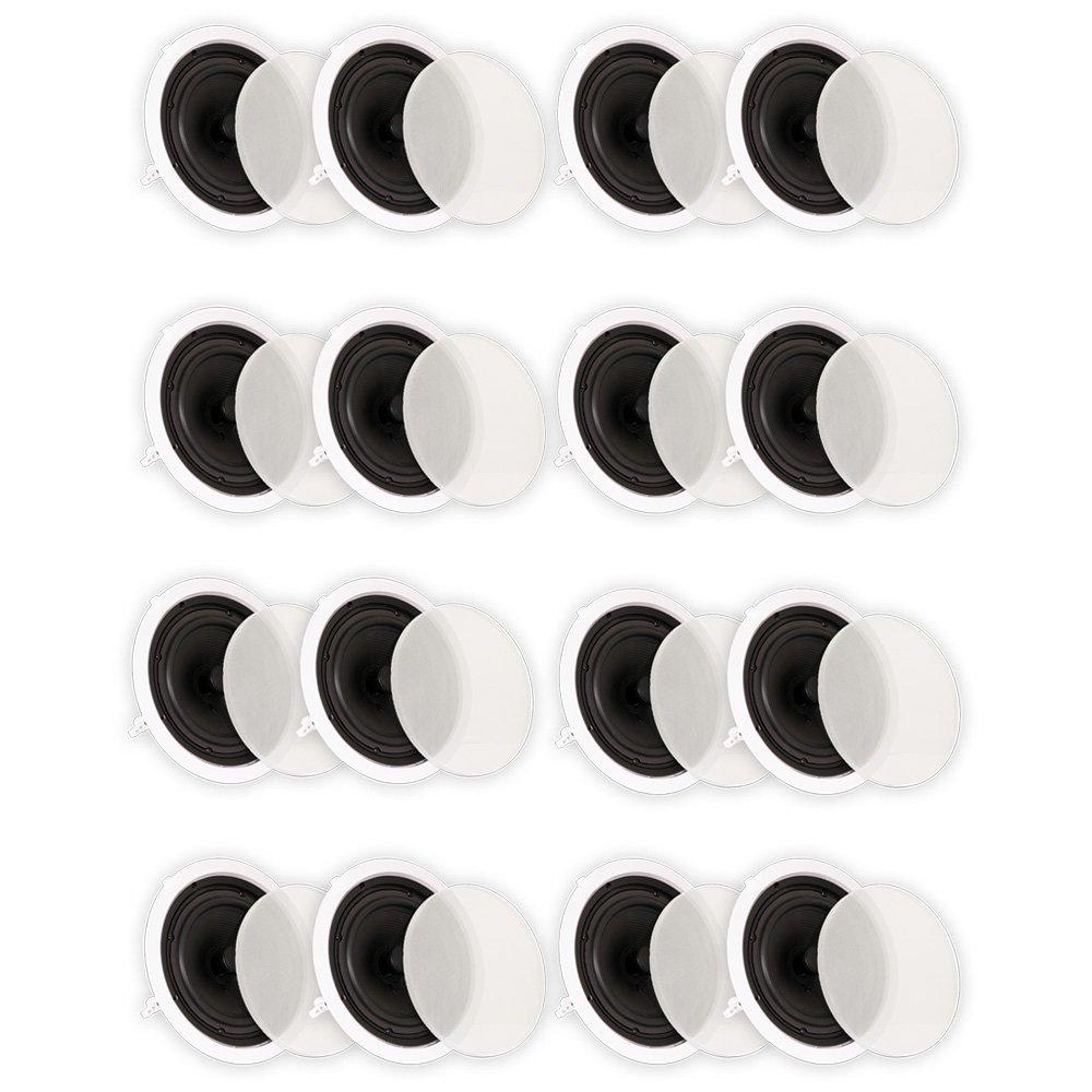Product Description Theater Solutions by Goldwood TS80C Flush Mount In Ceiling 16 Speaker SetWide Sound Dispersion Designed Speakers easily integrate with new and existing audio systemsTraditional Passive speaker design, simply drive power from your home audio receiver or ampFlush Mount low profile housings install easy with unique Pressure Lock Mounting SystemFull Range sound coverage with 2-way woofer and tweeter configuration8" Woven Fiber bulletproof cone woofers with butyl rubber surroundsPivoting Silk Titanium dome tweeters2nd Order 12dB per Octave CrossoversFrequency response is 32Hz-20 kHz with 92dB at 8ohmPressure Lock Mounting System clamps tight to drywall with No Hardware NeededFits round speaker hole size of 9.625" with a mounting depth of 3.5625"Overall speaker size of 11.0625" with Spring Loaded raw wire connectionsDurable ABS Housings and Removeable Grills can be painted to match your decorSystem RequirementsAny home audio receiver or amplifier with raw speaker wire outputsYour receiver power should be no less than 10 and no more than 250 watts per channelCL3 Rated in wall certified raw speaker wire to connect your receiver to the speakersApplicationsHome Theater Surround Sound SystemsWhole House Audio SystemsBusiness or Retail InstallationsWhat's in the boxes16 Flush Mount Passive Speakers with Removeable GrillsCut-Out TemplatesInstruction Manual