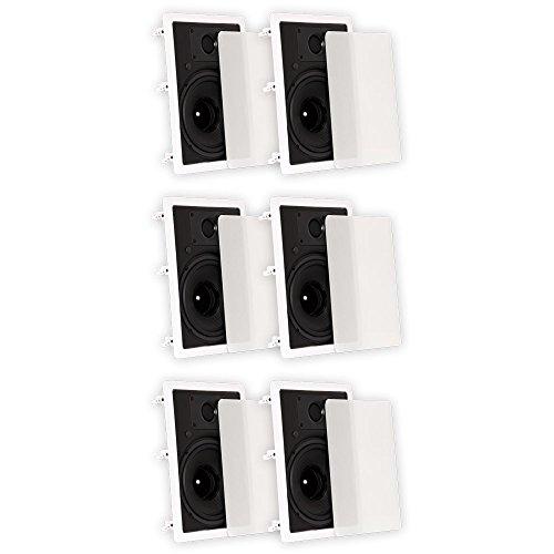 Product Description Theater Solutions by Goldwood TS80W Flush Mount In Wall 6 Speaker SetWide Sound Dispersion Designed Speakers easily integrate with new and existing audio systemsTraditional Passive speaker design, simply drive power from your home audio receiver or ampFlush Mount low profile housings install easy with unique Pressure Lock Mounting SystemFull Range sound coverage with 2-way woofer and tweeter configuration8" Woven Fiber bulletproof cone woofers with butyl rubber surroundsPivoting Silk Titanium dome tweeters2nd Order 12dB per Octave CrossoversFrequency response is 30Hz-20 kHz with 93dB at 8ohmPressure Lock Mounting System clamps tight to drywall with No Hardware NeededFits rectangular speaker hole size of 12.75" x 8.75" with a mounting depth of 3.5625"Overall speaker size of 14.125" x 10.6275" with Spring Loaded raw wire connectionsInfrared housing knock-out plug for optional remote control receiverDurable ABS Housings and Removeable Grills can be painted to match your decorSystem RequirementsAny home audio receiver or amplifier with raw speaker wire outputsYour receiver power should be no less than 10 and no more than 250 watts per channelCL3 Rated in wall certified raw speaker wire to connect your receiver to the speakersApplicationsHome Theater Surround Sound SystemsWhole House Audio SystemsBusiness or Retail InstallationsWhat's in the box6 Flush Mount Passive Speakers with Removeable GrillsCut-Out TemplatesInstruction Manual