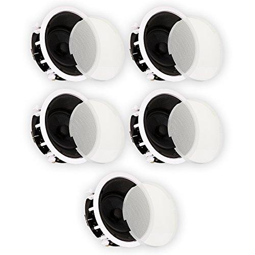 Product Description Theater Solutions by Goldwood TSS6A Flush Mount Angled In Ceiling 5 Speaker SetCenter Channel with Front and Rear, Right and Left home theater configurationAngled Wide Sound Dispersion Designed Speakers easily integrate with new and existing audio systemsTraditional Passive speaker design, simply drive power from your home audio receiver or amp15 Degree Angled Flush Mount housings direct the sound and install easy with Pressure Lock Mounting SystemFull Range sound coverage with 2-way woofer and tweeter configuration6.5" Interlaced glass fiber cone woofers with butyl rubber surroundsPivoting Liquid Cooled Silk Titanium dome tweeters3 Setting 0dB, -3dB and -6dB Tweeter Adjustment Switches2nd Order 18dB per Octave CrossoversFrequency response is 28Hz-21 kHz with 95dB at 8ohmPressure Lock Mounting System clamps tight to drywall with No Hardware NeededFits round speaker hole size of 8.625" with a mounting depth of 5"Overall speaker size of 9.5" with Spring Loaded raw wire connectionsDurable ABS Housings and Removeable Grills can be painted to match your decorSystem RequirementsAny home audio receiver or amplifier with raw speaker wire outputsYour receiver power should be no less than 10 and no more than 250 watts per channelCL3 Rated in wall certified raw speaker wire to connect your receiver to the speakersApplicationsHome Theater Surround Sound SystemsWhole House Audio SystemsBusiness or Retail InstallationsWhat's in the boxes5 Flush Mount Passive Speakers with Removeable GrillsCut-Out TemplatesInstruction Manual
