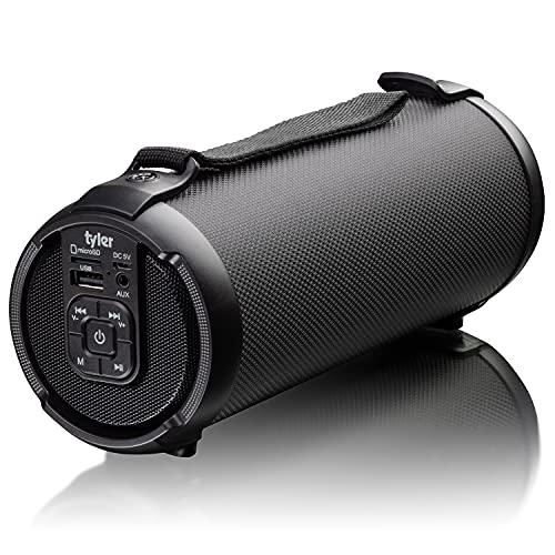 FEEL THE POWER: Our Tyler Bluetooth speaker comes equipped with 2.5" tweeter capable to product 100 watts of peak power and amplify 50W RMS at 4 OHM that provides a surround stereo sound production and extended bass so that you can feel your music.,WATER RESISTANT: Take it out by the pool or use it as a shower speaker. We had liquids in mind and of course the kids. Not designed for water submerging but can withstand light water splashes. Go the beach, rivers, dance in light rain, we go your covered!,ENDLESS CONECTIVITY: Jam packed with a wide range of connectivity. Bluetooth, USB, Micro SD, AUX Headphone Jack & Micro USB oh yes and FM Radio. Specifically designed for all music sources in mind. Now the question is when to connect not how to connect!,WIRELESS FREEDOM: Take it where you need it! Camping, walking, dancing, in your home, outdoors, our durable Bluetooth was designed for constant wear are tear so you can take it anywhere anytime! Also comes with a built in carrying handle for your comfort when your on the go!,BUILT IN ION BATTERY: No battery's? No problem, we have equipped our speaker with built-in 3.7V ION rechargeable battery's for your convenience. Roughly 3+ hours of wireless play time so that you will be able to take your jam anywhere without a power source.