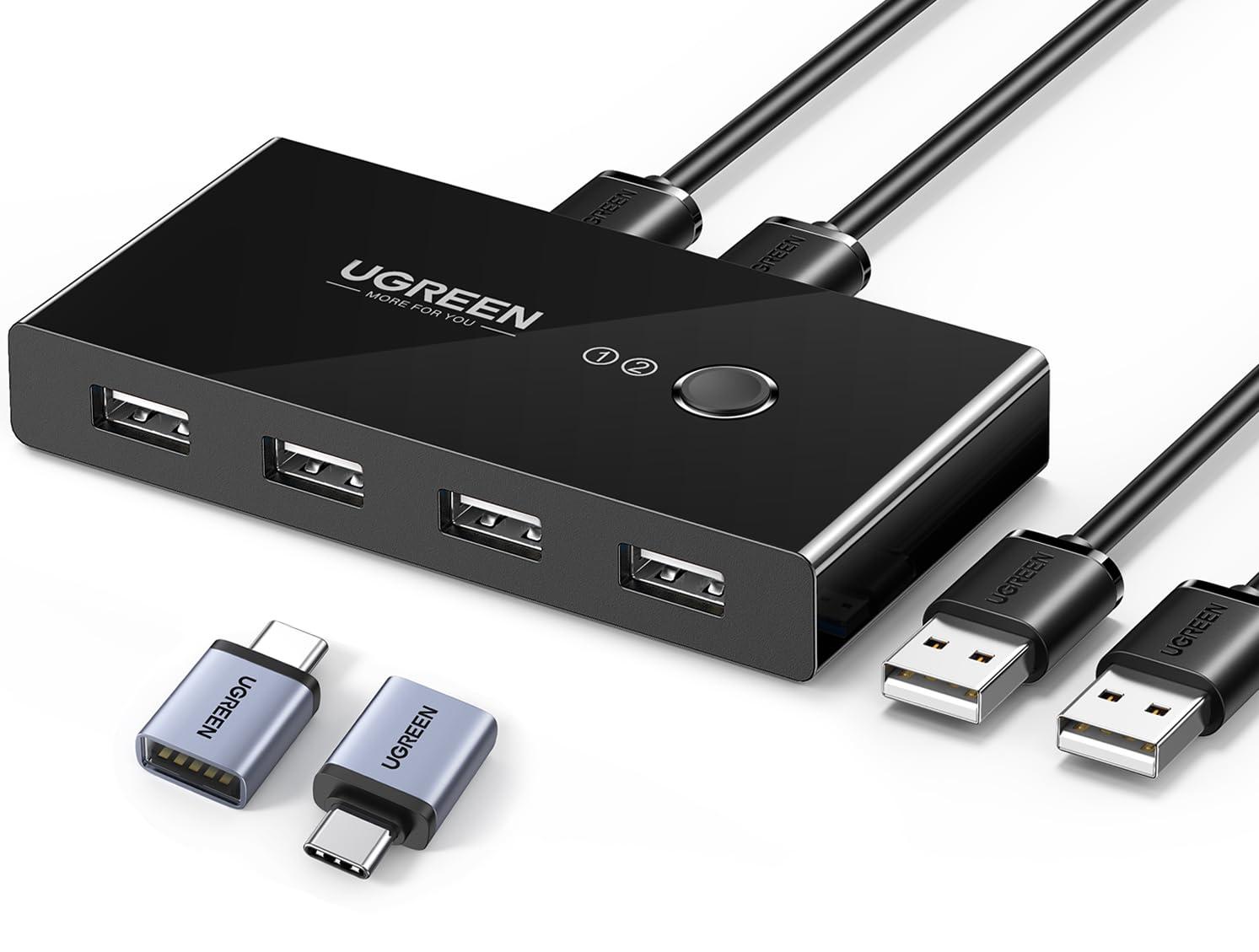 - 2 in 4 Out USB Switch Box: UGREEN 4 port USB sharing switch allows one button swapping between 2 computers to share 4 USB 2.0 peripheral devices without constantly swapping cables or setting up complicated network sharing software.