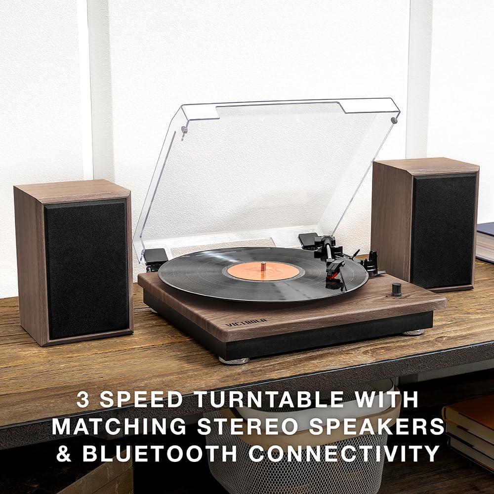 Classic Style And Modern Technology. Experience the timeless charm of music with the Victrola Montauk Turntable, a masterpiece of classical styling fused with modern functionality. Crafted with an elegant warm wood finish, this belt-driven record player brings your vinyl collection to life with its exceptional sound quality and minimal vibrations. Boasting three speeds (33 1/3, 45, and 78 RPM), it offers the versatility to play your cherished records in their original glory. Enhance your auditory journey with the matching stereo Bluetooth speakers, designed to complement the Victrola Record Player seamlessly. These 12-watt bookshelf speakers deliver rich, immersive sound wirelessly via Bluetooth, enabling you to stream music effortlessly from any smart device. Whether it's the nostalgic crackle of vinyl or your favorite digital tracks, these speakers ensure an enriching listening experience. Immerse yourself in a dynamic listening adventure tailored to your preferences. With RCA out and Bluetooth streaming capabilities, the Victrola Montauk Turntable effortlessly integrates into your entertainment system. Additionally, its 3.5mm aux-in headphone jack offers the option for private listening, perfect for those moments of personal musical indulgence. Combining aesthetics with functionality, this Bluetooth record player exudes sophistication with its sleek design, wood finish, and clear acrylic dust cover, making it a timeless addition to any entertainment setup.
