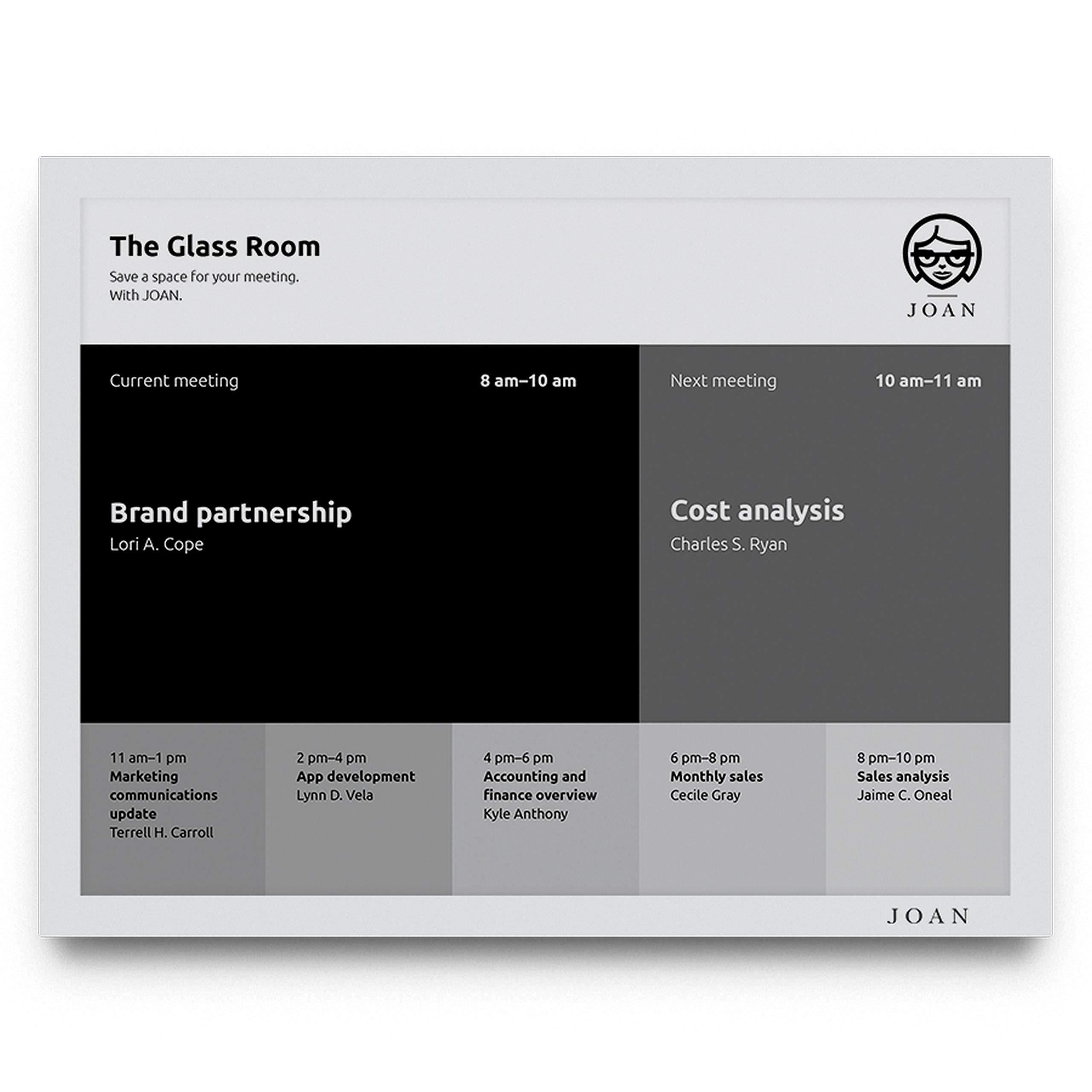 Joan Premium, one in the line of the award-winning Joan room scheduling solutions, offers the most comprehensive overview of meeting room availability, right where you need it most - at the conference room door. See the meeting currently taking place, the next one coming up, and the five that follow. All on the intuitive, easy-to-read interface of an elegant 13-inch room display that feels at home in any interior. The non-intrusive, Elegant nature of Joan Premium's electronic paper screen beautifully blends with any office design and does not distract with the glare that LCDs produce. Perfect for high-end executive boardrooms with centralized booking.