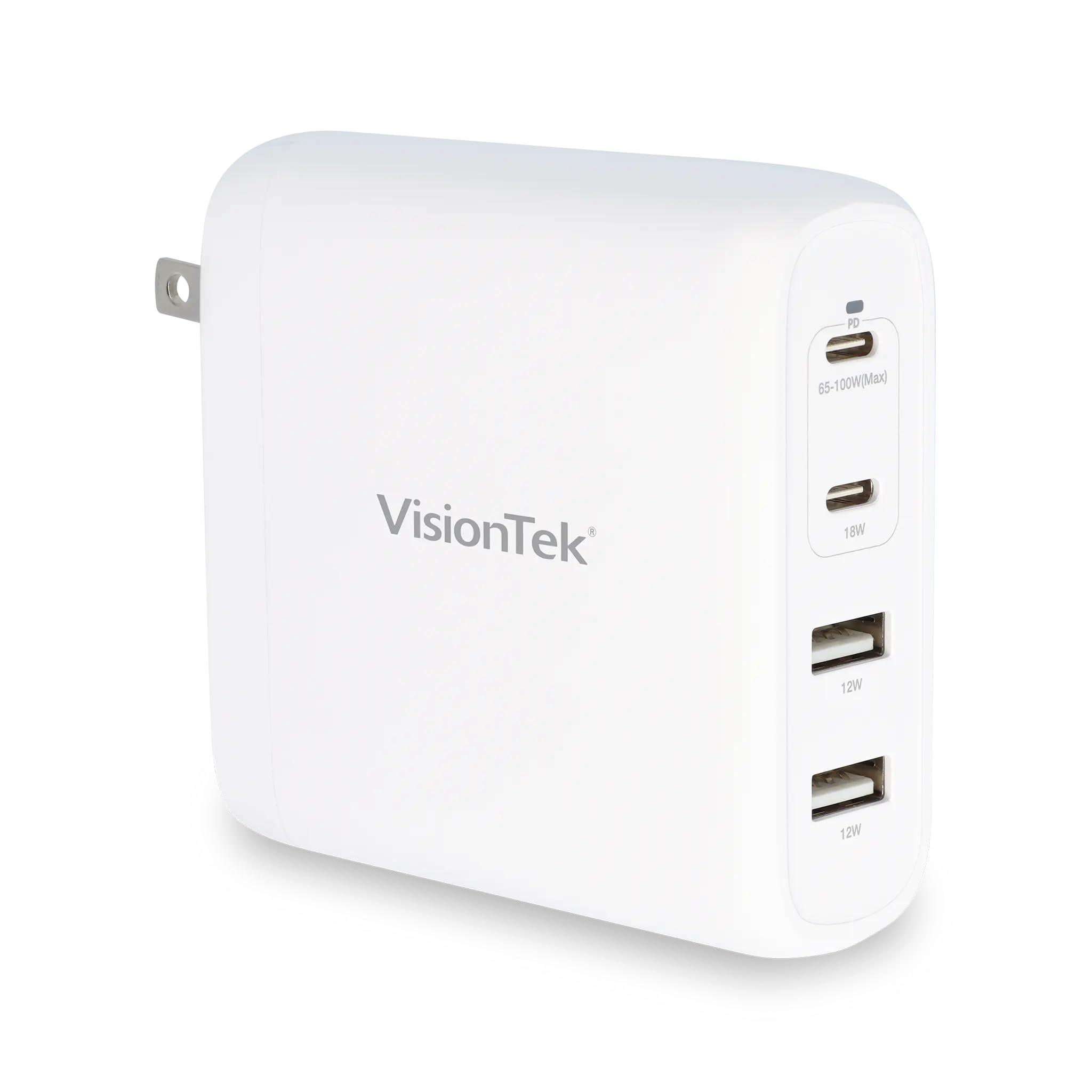 Mobile life powered up with GaN II fast charging power adapters from VisionTek. Change the way you charge up your devices. Powerful charging packed in an optimized compact mobile package. - Fast Charge a mobile device 0-50% in 30min* Fast Charge 4 devices at the same time - 100W total Support for USB-C PD 3.0 and PPS Universal Fast Charging on mobile devices: iPhone 8 or later, iPad Pro, Samsung Galaxy S22 and more Charge Laptops such as Dell XPS 13, MacBook Air, MacBook Pro 2020 13in (Intel), MacBook Pro 2019 16in (Intel), LG Gram, HP Envy, Chromebook and more Sleek Compact Design powered by GaN II technology *Tested on fully drained iPhone 13 Pro. Charge time varies with environmental factors; actual results will vary.