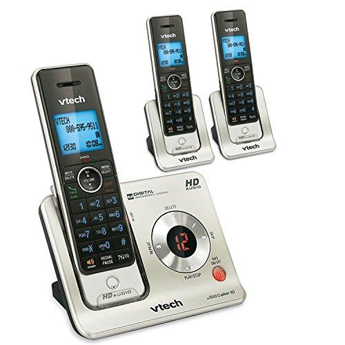 - VTech cordless phone with answering system- Three handsets included- DECT 6.0 Digital technology provides the best sound quality, security and range in cordless phones - Expandable up to 12 handsets using only one phone jack--uses DS6201 accessory handsets - Interference free - Digital answering system - Handset speakerphone- Caller ID/call waiting*stores 50 calls - Interference free for crystal clear conversations - Protect yourself from identity theft with digital security- 14 Minutes of recording time - Answering system available from handset - Audible time and date stamp on recorded messages - Backlit message counter - Digital answering systemno tapes or moving parts - Remote message retrievalcall in from anywhere to get your messages - 50 name and number phonebook directoryeasily store and dial frequently called numbers - Conference an outside call between handsets - Intercom between handsets- Transfer calls between handsets - 100% RoHS compliant - Any key answer - Blue backlit keypad and display - Comfortable handset size - ENERGY STAR qualified cordless phone - Extra-large handset display includes larger characters and provides easier viewing - Handset volume control - Last number redial - Page/handset locator - Selectable ring tones - Trilingual promptschoose between English, Spanish or French - Voicemail waiting indicator - Wall mount bracket included - WiFi friendlywon't interfere with wireless networks VTDS62213