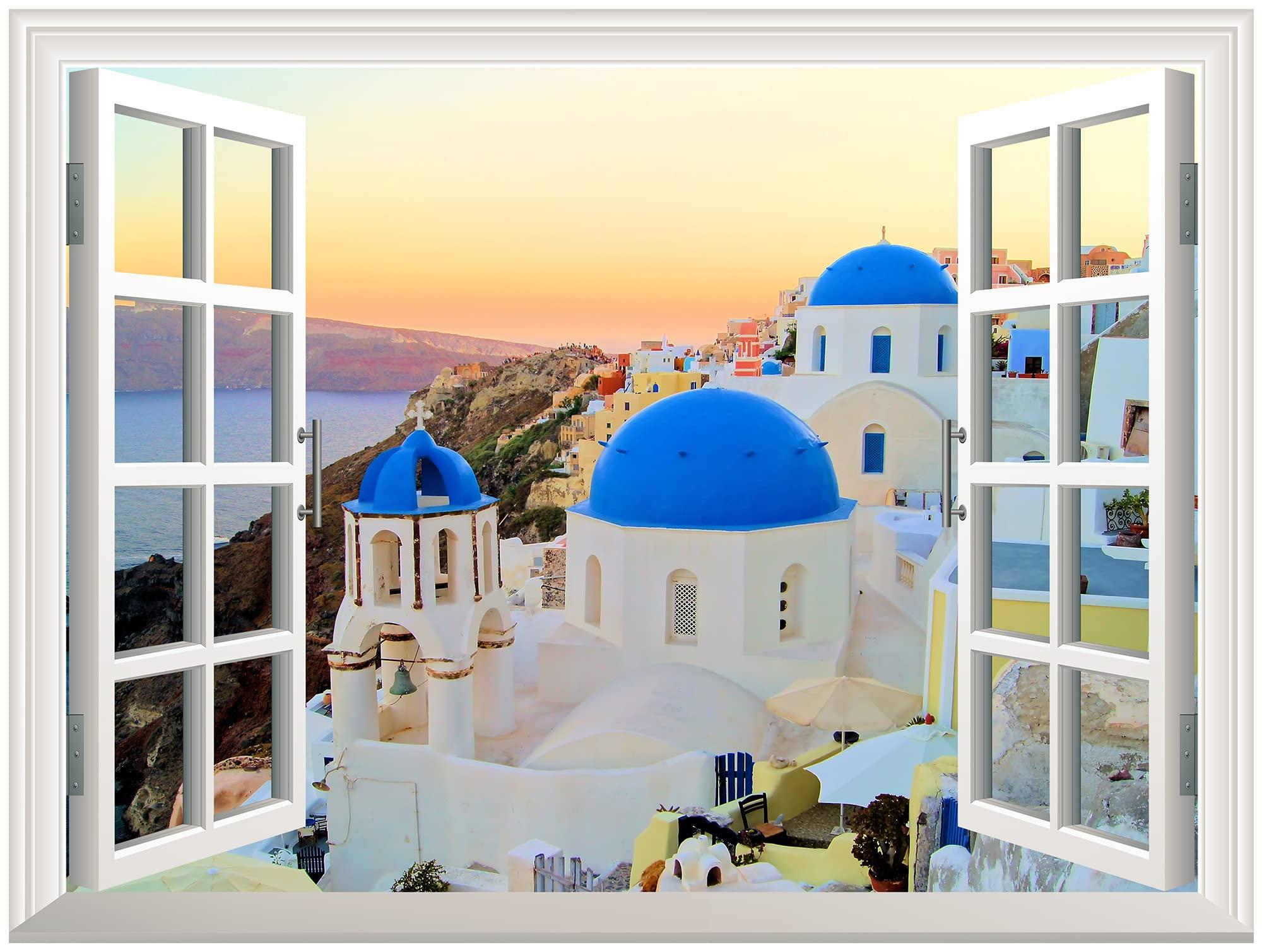 wall26 Removable Wall Sticker/Wall Mural - Sunset View of The Blue Dome Churches of Santorini, Greece | Creative Window View Home Decor/Wall Decor - 36\"x48\"