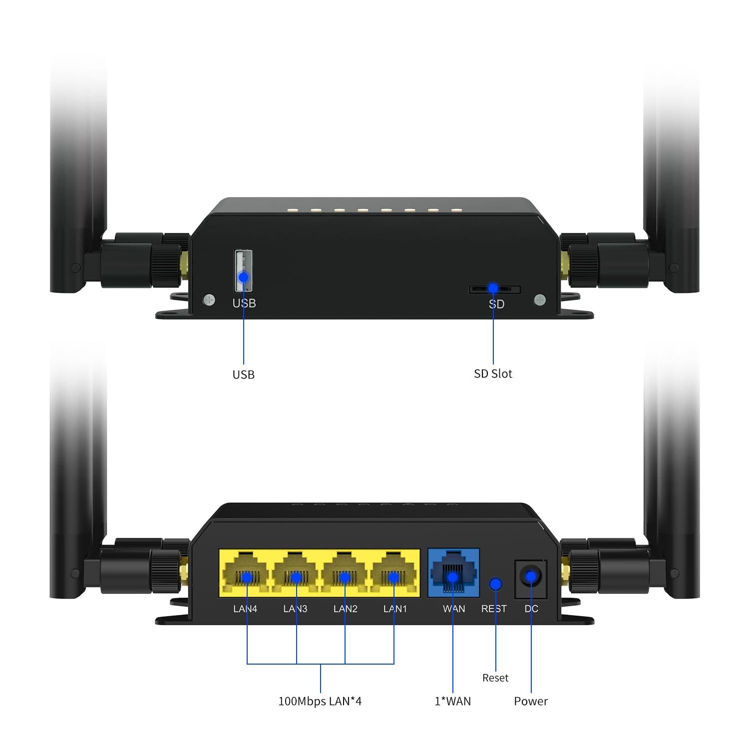 - Variety of interfaces1*100Mbps WAN Port, 4* 100Mbps LAN Port, 1* USB 2.0 port and 1* TF card slot. Support SAMBA, FTP, enables wireless routers to share files.