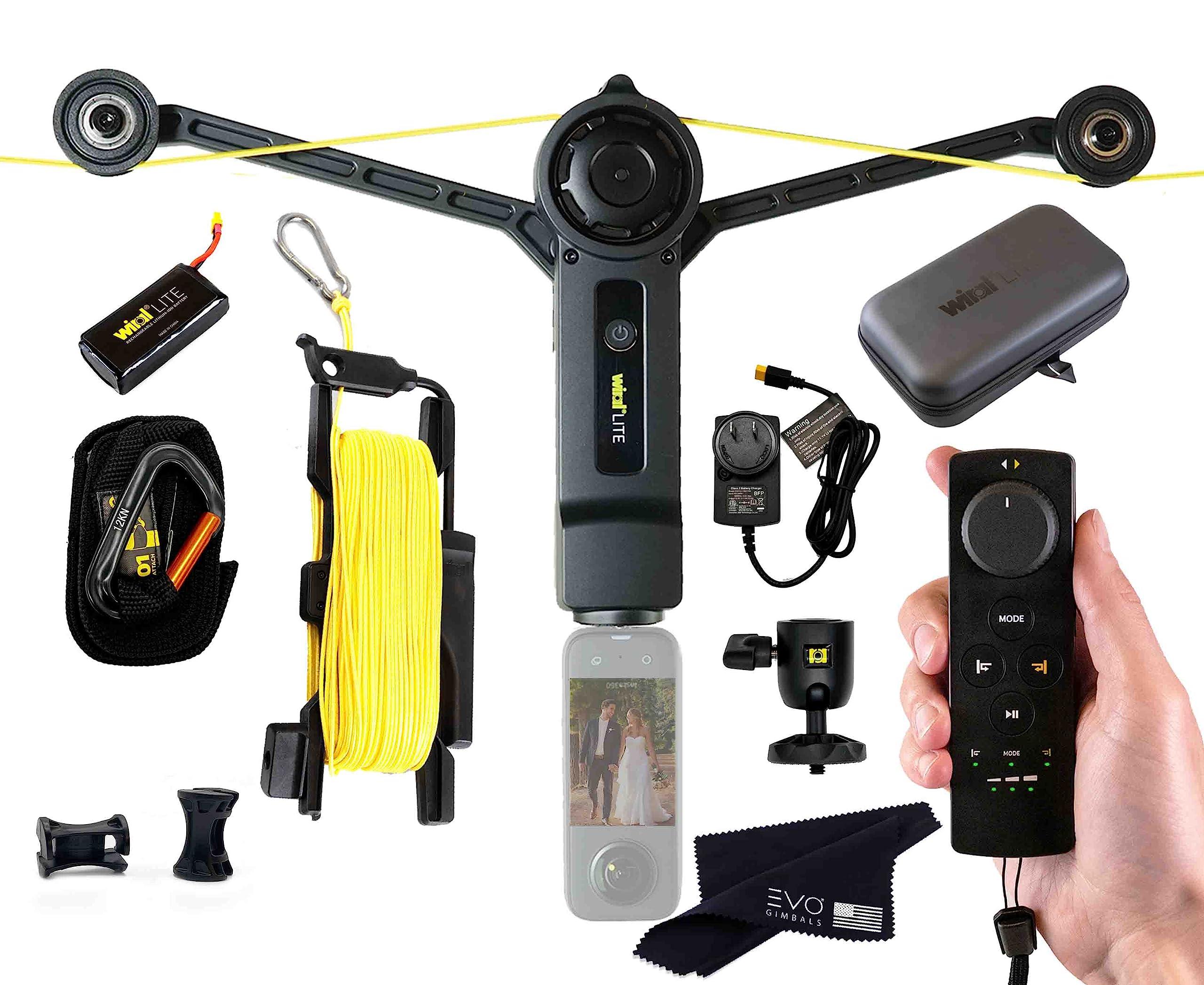 - BUNDLE INCLUDES: x1 Wiral LITE Cable Cam Unit,x1 Quick Reel 50m (164'), x1 Quick Reel Tightening Strap, x1 Remote Control, x1 High Capacity Battery, x1 Universal Battery Charger, x2 End Stop Clips, x1 Ball Joint Mount