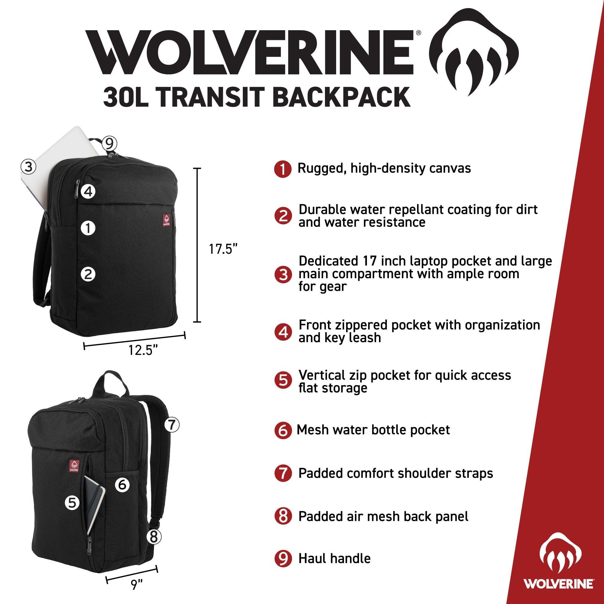 - STURDY AND DURABLE: The WOLVERINE 30L Transit Backpack is built to last and withstand wear and tear. Made with High-Density Canvas constructed from high strength textured polyester that has superior tensile durability, as well as a dirt and water-resistant surface coating. This backpack is both sturdy and durable, making it the ideal choice for any outdoor adventure.