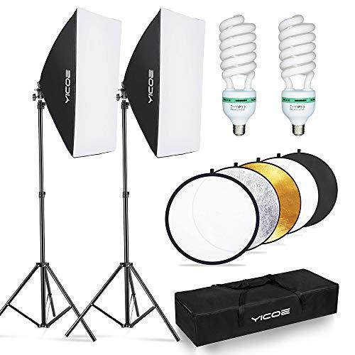 - The kit includes: 2 x Soft Box with Bulb Socket, 2 x Light Stand, 2 x 95W 130V Photo Bulb, 1 x 60cm 5-In-1 Reflector, 2x softbox white cloth cover, 1 x Carry Case. Suitable for Various Photography: YICOE softbox lighting kit provides classic soft but crisp light. Perfect for studio portraits shooting, home studio lighting, fashion photo shooting or still life shots, portrait, wedding formals, live streaming, gaming streaming, video recording, interview, Youtube, etc.